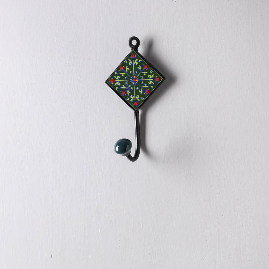 This finely done green wall hanger is crafted from blue pottery ceramic tile & iron rod. It has 1 peg for hanging keys, coat, towel or any clothing, has one wall mount hook on the back for easy hanging. Blue Pottery is widely recognized as a traditional craft of Jaipur, though it is Turko-Persian in origin. The name 'blue pottery' comes from the eye-catching blue dye used to color the pottery. Jaipur blue pottery, made out of a similar frit material to Egyptian faience, is glazed and low-fired. No clay is used: the 'dough' for the pottery is prepared by mixing quartz stone powder, powdered glass, Multani Mitti (Fuller's Earth), borax, gum and water. It is the only pottery in the world that does not use clay.