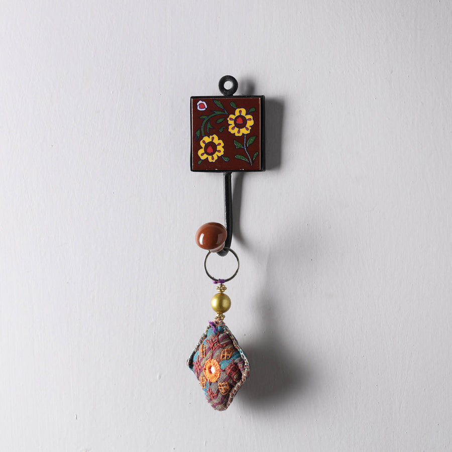 This finely done brown wall hanger is crafted from blue pottery ceramic tile & iron rod. It has 1 peg for hanging keys, coat, towel or any clothing, has one wall mount hook on the back for easy hanging. Blue Pottery is widely recognized as a traditional craft of Jaipur, though it is Turko-Persian in origin. The name 'blue pottery' comes from the eye-catching blue dye used to color the pottery. Jaipur blue pottery, made out of a similar frit material to Egyptian faience, is glazed and low-fired. No clay is used: the 'dough' for the pottery is prepared by mixing quartz stone powder, powdered glass, Multani Mitti (Fuller's Earth), borax, gum and water. It is the only pottery in the world that does not use clay.