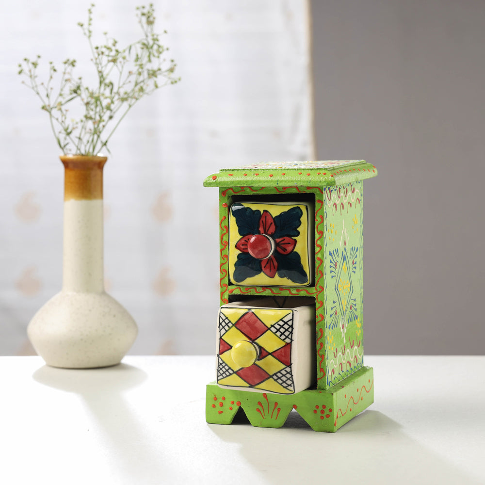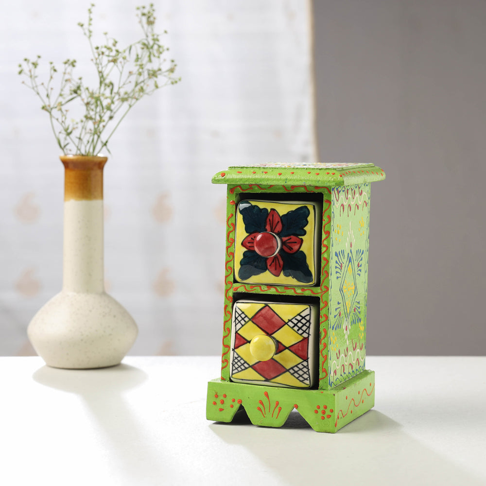 Multi-utility green double drawer made from blue pottery ceramic tile with hand painted natural neem wood. Blue Pottery is widely recognized as a traditional craft of Jaipur, though it is Turko-Persian in origin. The name 'blue pottery' comes from the eye-catching blue dye used to color the pottery. Jaipur blue pottery, made out of a similar frit material to Egyptian faience, is glazed and low-fired. No clay is used: the 'dough' for the pottery is prepared by mixing quartz stone powder, powdered glass, Multani Mitti (Fuller's Earth), borax, gum and water. It is the only pottery in the world that does not use clay.