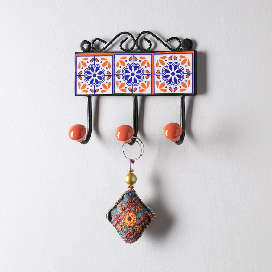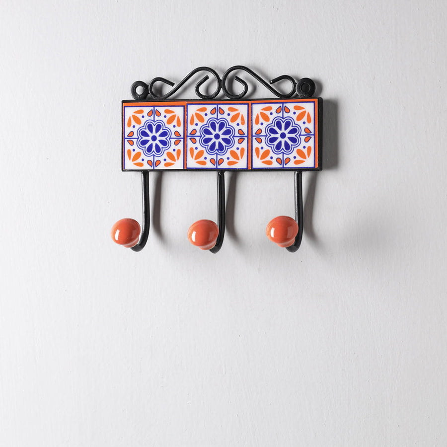 This finely done orange wall hanger is crafted from blue pottery ceramic tile & iron rod. It has 3 peg for hanging keys, coat, towel or any clothing, has two wall mount hook on the back for easy hanging. Blue Pottery is widely recognized as a traditional craft of Jaipur, though it is Turko-Persian in origin. The name 'blue pottery' comes from the eye-catching blue dye used to color the pottery. Jaipur blue pottery, made out of a similar frit material to Egyptian faience, is glazed and low-fired. No clay is used: the 'dough' for the pottery is prepared by mixing quartz stone powder, powdered glass, Multani Mitti (Fuller's Earth), borax, gum and water. It is the only pottery in the world that does not use clay.