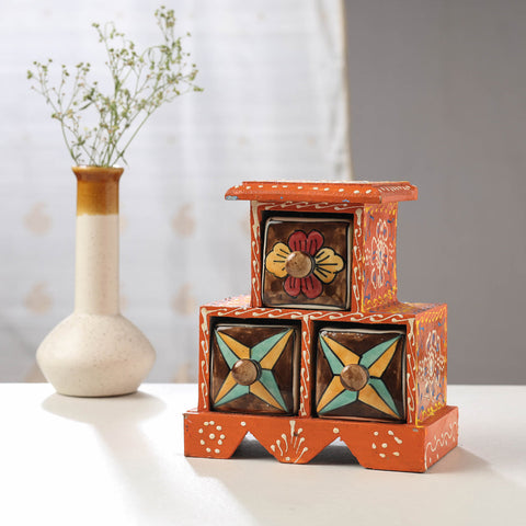 Multi-utility orange triple drawer made from blue pottery ceramic tile with hand painted natural neem wood. Blue Pottery is widely recognized as a traditional craft of Jaipur, though it is Turko-Persian in origin. The name 'blue pottery' comes from the eye-catching blue dye used to color the pottery. Jaipur blue pottery, made out of a similar frit material to Egyptian faience, is glazed and low-fired. No clay is used: the 'dough' for the pottery is prepared by mixing quartz stone powder, powdered glass, Multani Mitti (Fuller's Earth), borax, gum and water. It is the only pottery in the world that does not use clay.
