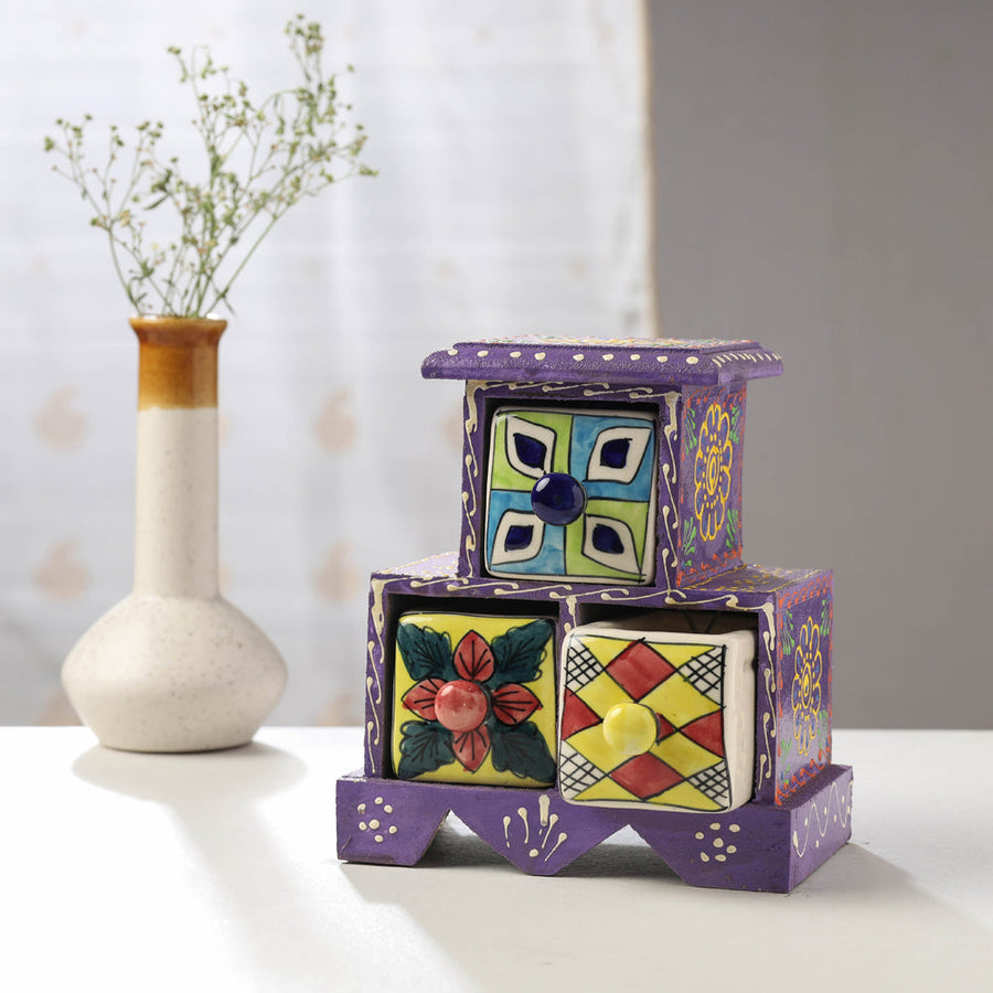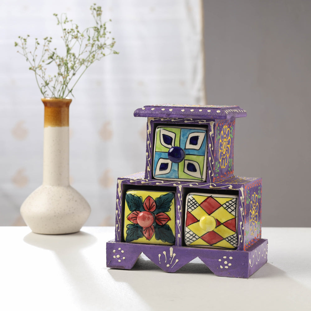 Multi-utility purple triple drawer made from blue pottery ceramic tile with hand painted natural neem wood. Blue Pottery is widely recognized as a traditional craft of Jaipur, though it is Turko-Persian in origin. The name 'blue pottery' comes from the eye-catching blue dye used to color the pottery. Jaipur blue pottery, made out of a similar frit material to Egyptian faience, is glazed and low-fired. No clay is used: the 'dough' for the pottery is prepared by mixing quartz stone powder, powdered glass, Multani Mitti (Fuller's Earth), borax, gum and water. It is the only pottery in the world that does not use clay.