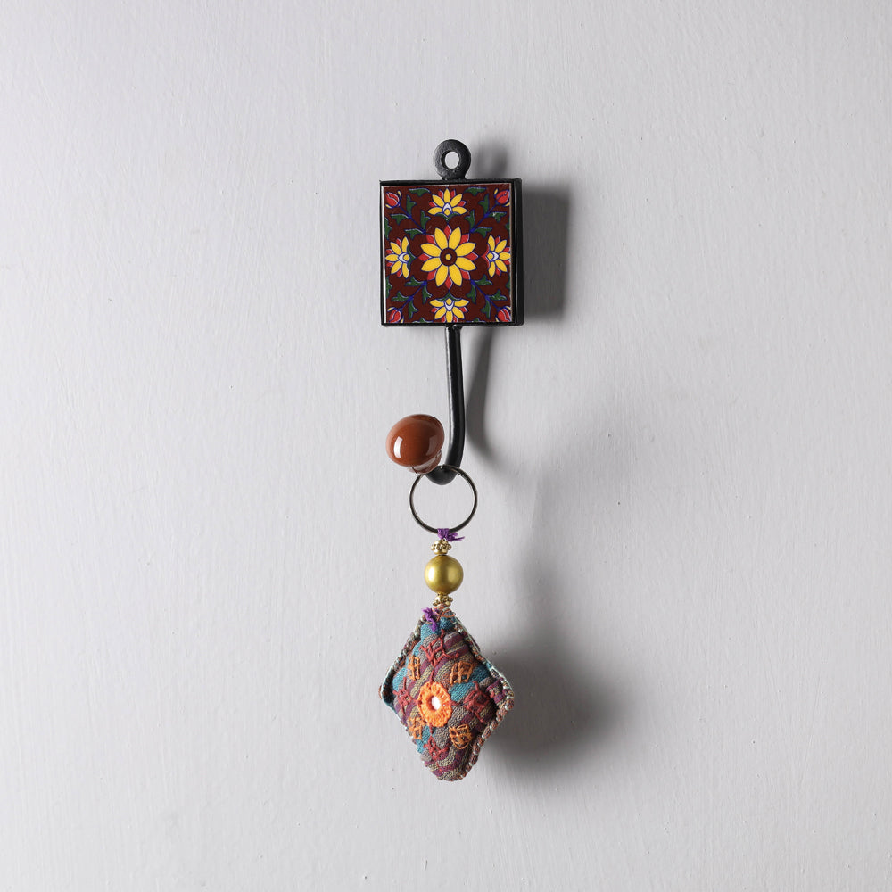 This finely done brown wall hanger is crafted from blue pottery ceramic tile & iron rod. It has 1 peg for hanging keys, coat, towel or any clothing, has one wall mount hook on the back for easy hanging. Blue Pottery is widely recognized as a traditional craft of Jaipur, though it is Turko-Persian in origin. The name 'blue pottery' comes from the eye-catching blue dye used to color the pottery. Jaipur blue pottery, made out of a similar frit material to Egyptian faience, is glazed and low-fired. No clay is used: the 'dough' for the pottery is prepared by mixing quartz stone powder, powdered glass, Multani Mitti (Fuller's Earth), borax, gum and water. It is the only pottery in the world that does not use clay.