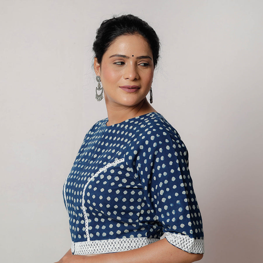Fine quality bagru dabu hand printed cotton blouse made from cotton fabrics & textured with handmade textiles of India. Dabu is an ancient mud-resist technique from Rajasthan, where traditional block-print motifs are artistically impressed upon the fabric by hand. Each item is handcrafted with the dabu block-printing technique, using 100% natural dye, and might carry variations of color, patterns and other delicate inefficiencies.