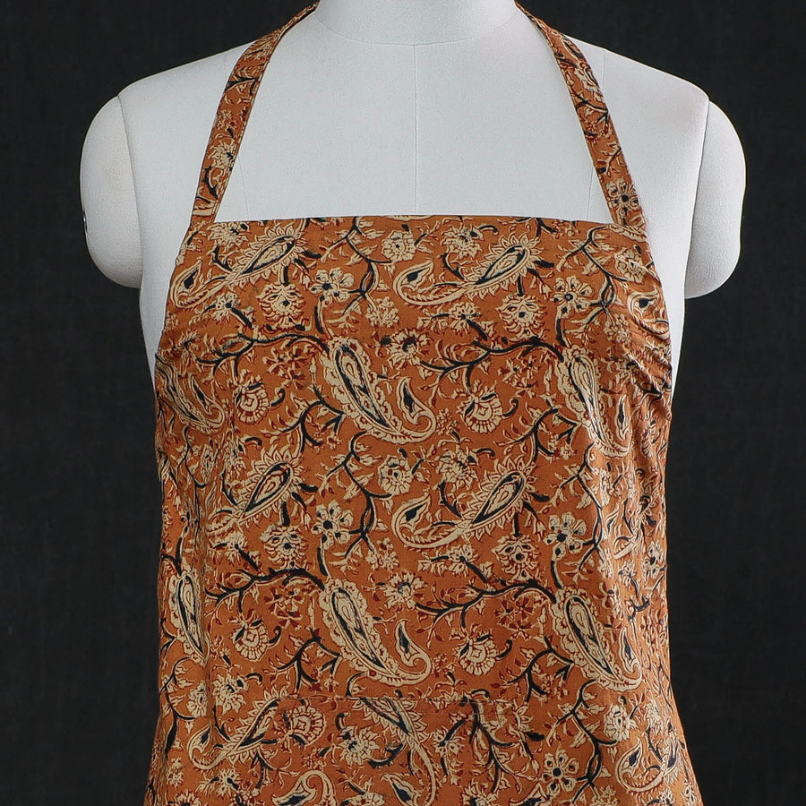 Between oil splatters, flour-covered counters, and food flying from the mixer, it's no secret that cooking can get messy. This orange kalamkari block printed cotton apron with pocket for easy-access storage is a must-have kitchen essential. The gorgeous block prints on it will make you look stylish when you cook delicious food. Kalamkari is the earliest and more complex technique of block-printing. Showcasing an assortment of hand block printed motifs inspired by traditional kalamkari painting.