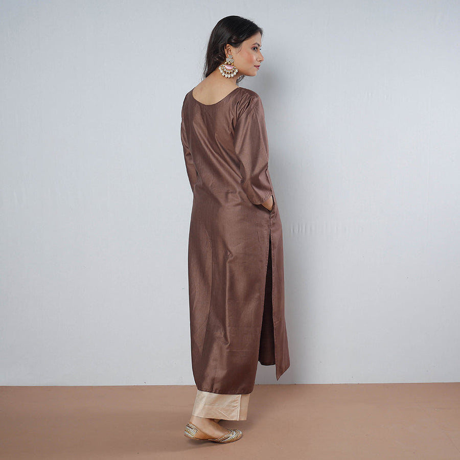 Fine quality plain tussar silk long Kurta with side pocket. Tussar silk is known for its unique texture, sheen of silk and feel of cotton. A perfect blend of both worlds completely suitable for all weathers. Exquisite collection of pure handwoven tussar silk fabrics that showcases beautifully handwoven textures.