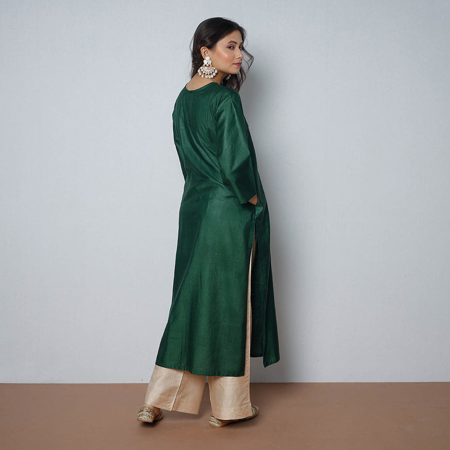 Fine quality plain tussar silk long Kurta with side pocket. Tussar silk is known for its unique texture, sheen of silk and feel of cotton. A perfect blend of both worlds completely suitable for all weathers. Exquisite collection of pure handwoven tussar silk fabrics that showcases beautifully handwoven textures.