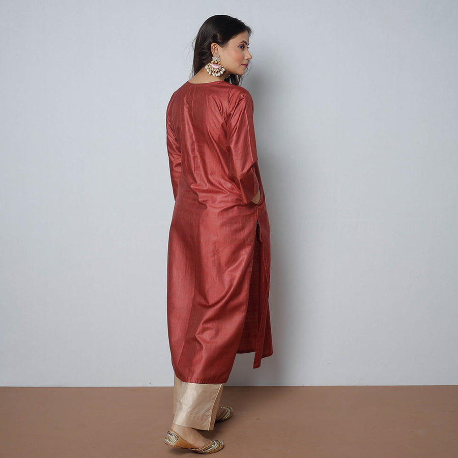 Fine quality plain tussar silk long kurta with side pocket. Tussar silk is known for its unique texture, sheen of silk and feel of cotton. A perfect blend of both worlds completely suitable for all weathers. Exquisite collection of pure handwoven tussar silk fabrics that showcases beautifully handwoven textures.