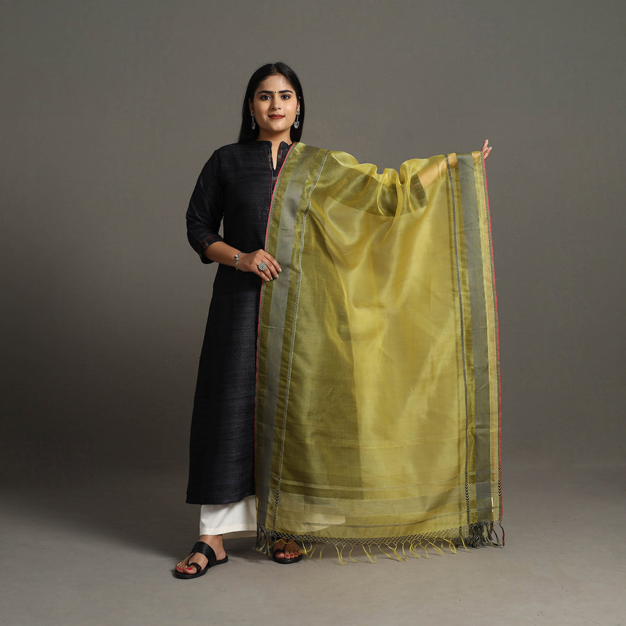 Fine quality traditional yellow maheshwari silk-cotton handloom dupatta with intricate woven zari work. Its lightweight and sheer texture giving an exquisite grace and elegance of its own. The weaving tradition has been practised in their family for many generations.