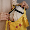 This yellow shoulder bag is made from silk-cotton fabric with soft foam inside. It is designed with contemporary patterns and hand embroidered using the Uttarakhand traditional craft technique of Kantha Tagai using thread yarns. It has a zip pocket inside.