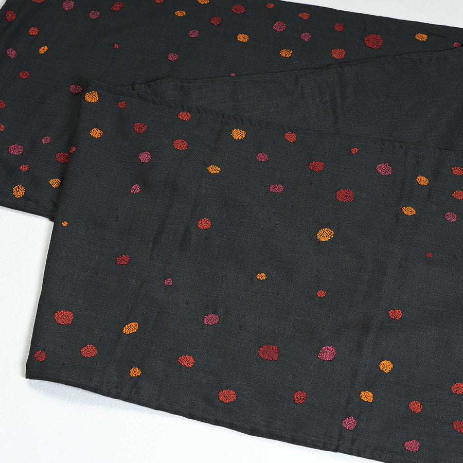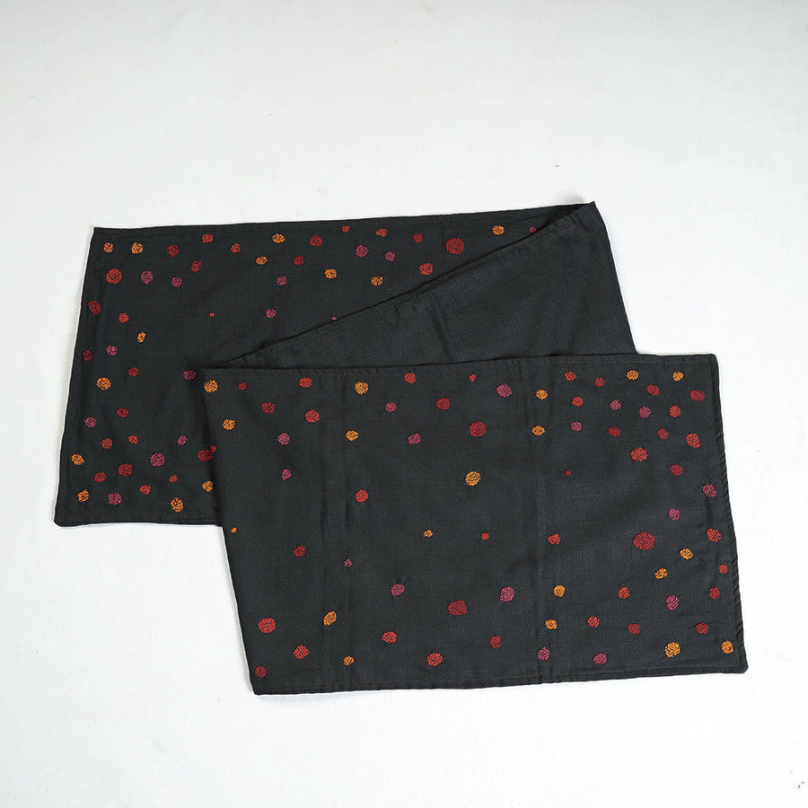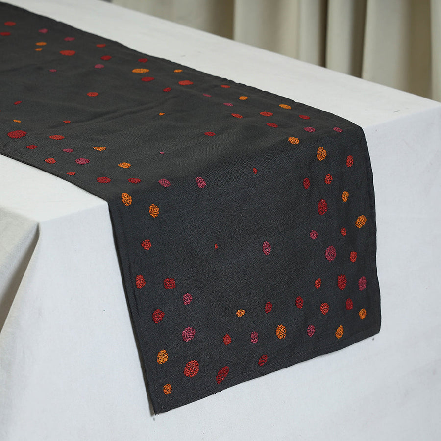 This grey kantha work table runner is made from silk-cotton fabric. It is designed with contemporary patterns & has been hand embroidered by Uttarakhand traditional craft technique of kantha tagai using thread yarns.