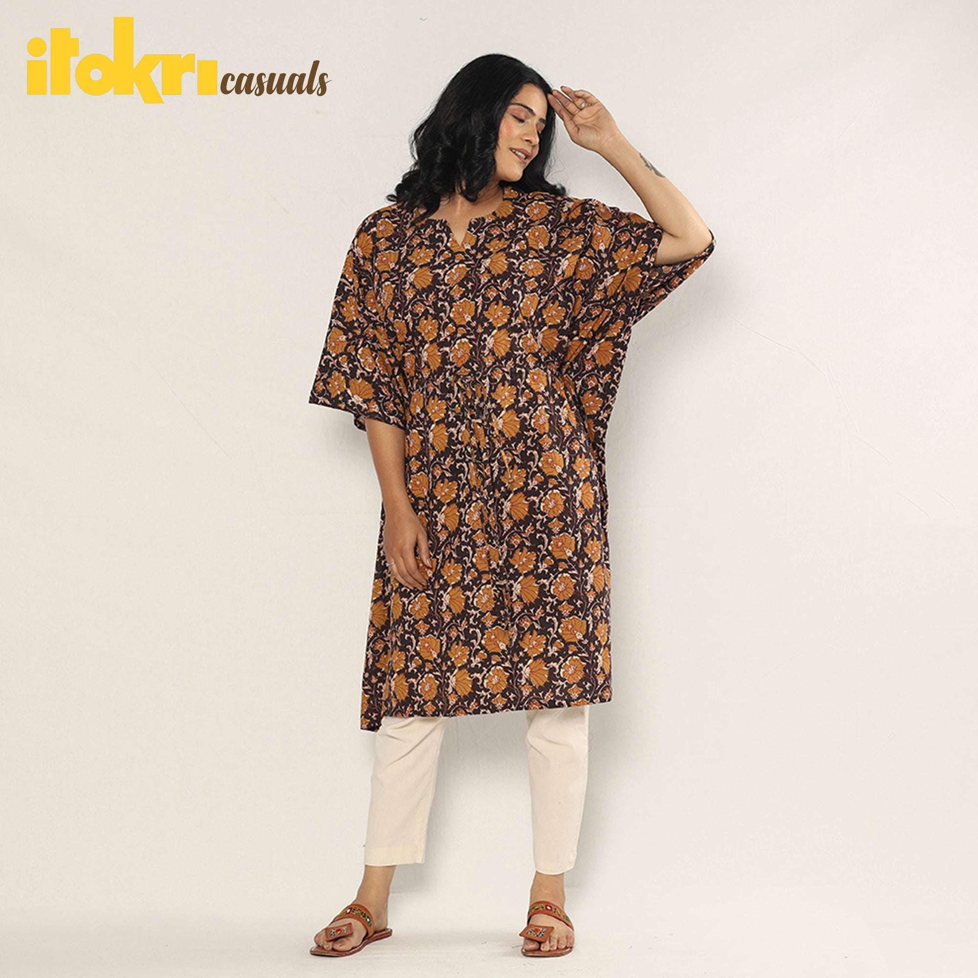 Fine quality bagru dabu block printed cotton knee length kaftan. A traditional kaftan or caftan is an knee-length garment with long, flowing sleeves. It has an adjustable drawstring waist. These loose-fitting cotton kaftans are enhanced by a soft touch and beautiful tie-dye patterns. This dress will allow you to move with ease and comfort. The drawstring waist tie will give you the freedom to customize the fit to suit your unique shape.
