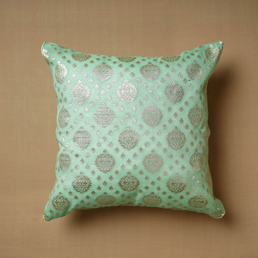Fine qualityBanarasi brocade kinkhab silk patch cotton cushion cover, These banarasi cushion covers are going to be a beautiful addition to your home in vibrant jewel tones, the cushion cover have intricately woven motifs in silk, with gold zari accents.