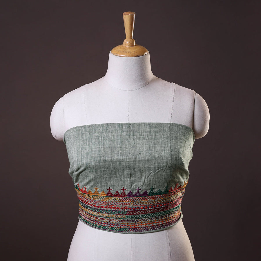 This grey handspun fine cotton blouse piece features intricate Lambani embroidery, known for its bold patterns and detailed needlework. The textured fabric offers a soft, breathable feel, making it ideal for everyday or festive wear. Pair it with your favourite sarees to add a touch of vibrant tradition and artisanal elegance to your outfit.