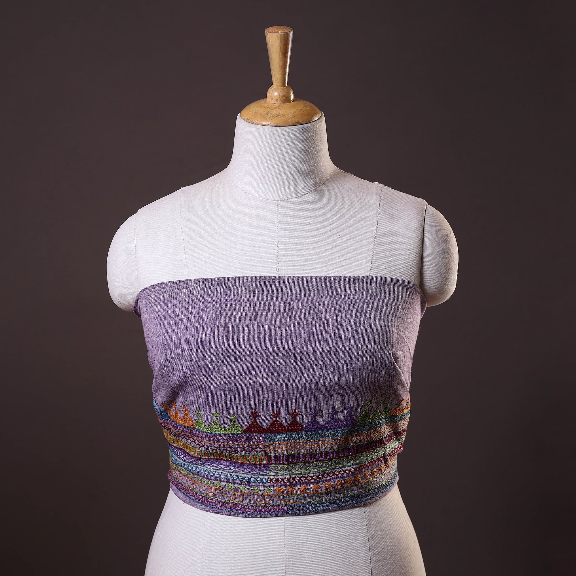 This purple handspun fine cotton blouse piece features intricate Lambani embroidery, known for its bold patterns and detailed needlework. The textured fabric offers a soft, breathable feel, making it ideal for everyday or festive wear. Pair it with your favourite sarees to add a touch of vibrant tradition and artisanal elegance to your outfit.