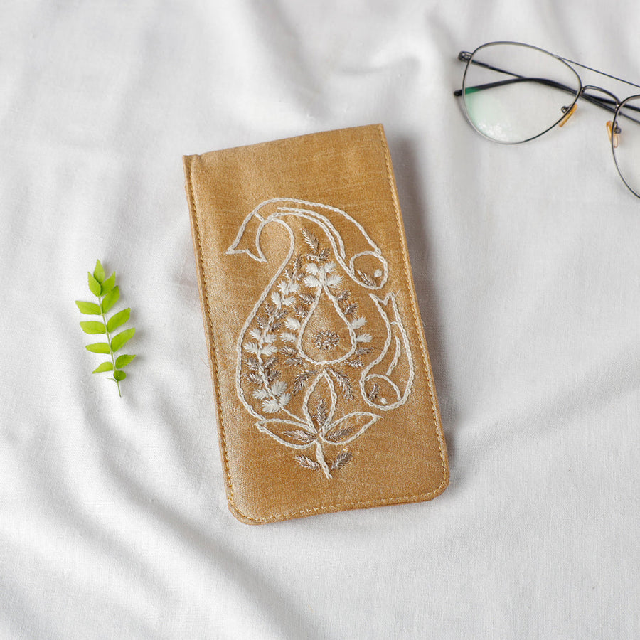 Intricate and artfully done lucknowi chikankari zari hand embroidered art silk brown spectacle case. Chikankari is a traditional textile decorative from Lucknow. It is very delicate and intricate hand embroidery work where thread is embroidered of cool, pastel shades on light fabrics.