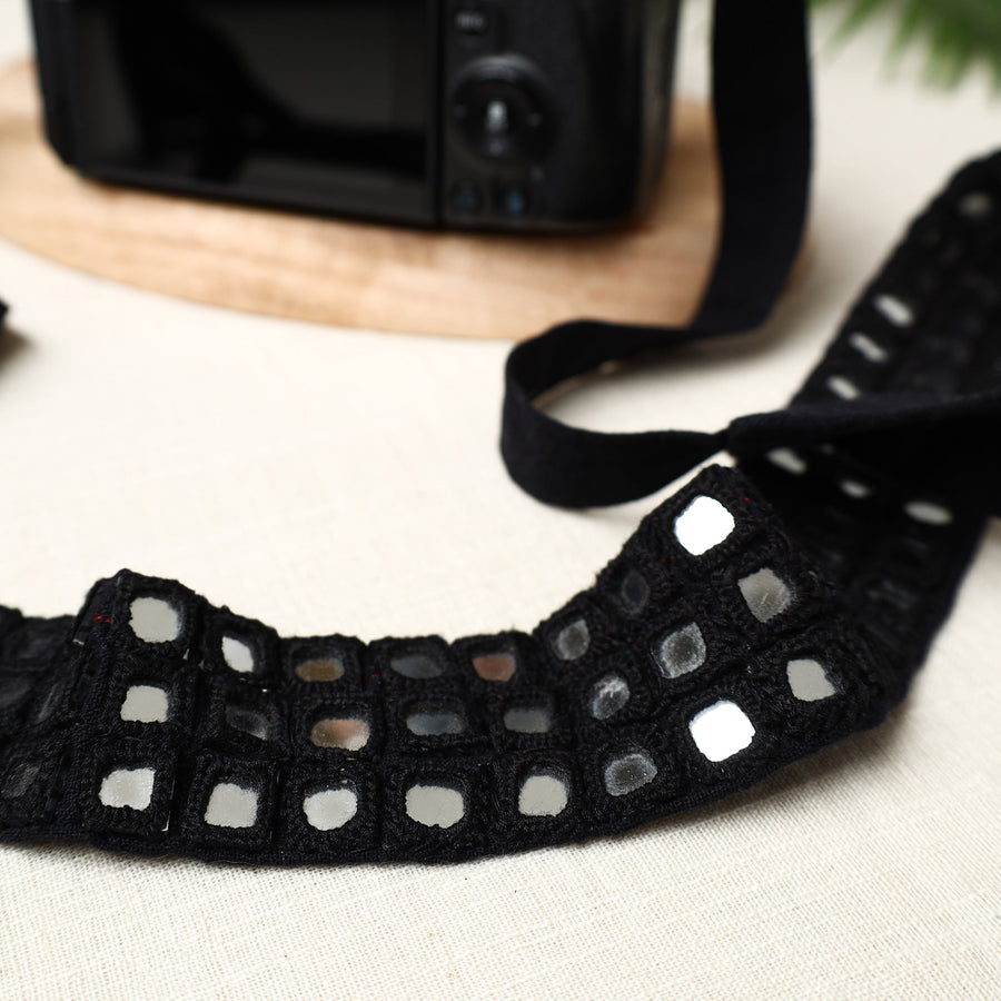 Handcrafted mirror work kutch hand embroidery cotton camera belt. The Kutch Embroidery is a handicraft and textile signature art tradition of the tribal community of kutch district in Gujarat. This embroidery with its rich designs has made a notable contribution to the Indian embroidery traditions. The embroidery, practiced normally by women is generally done on fabrics of cotton, in the form of a net using cotton or silk thread.