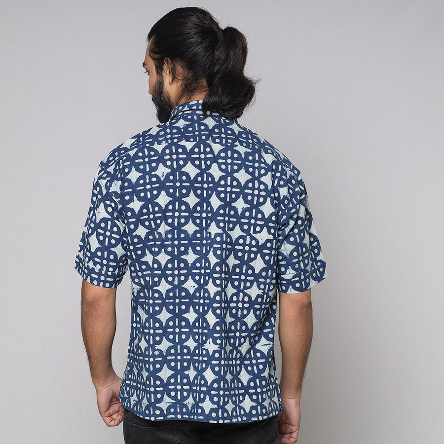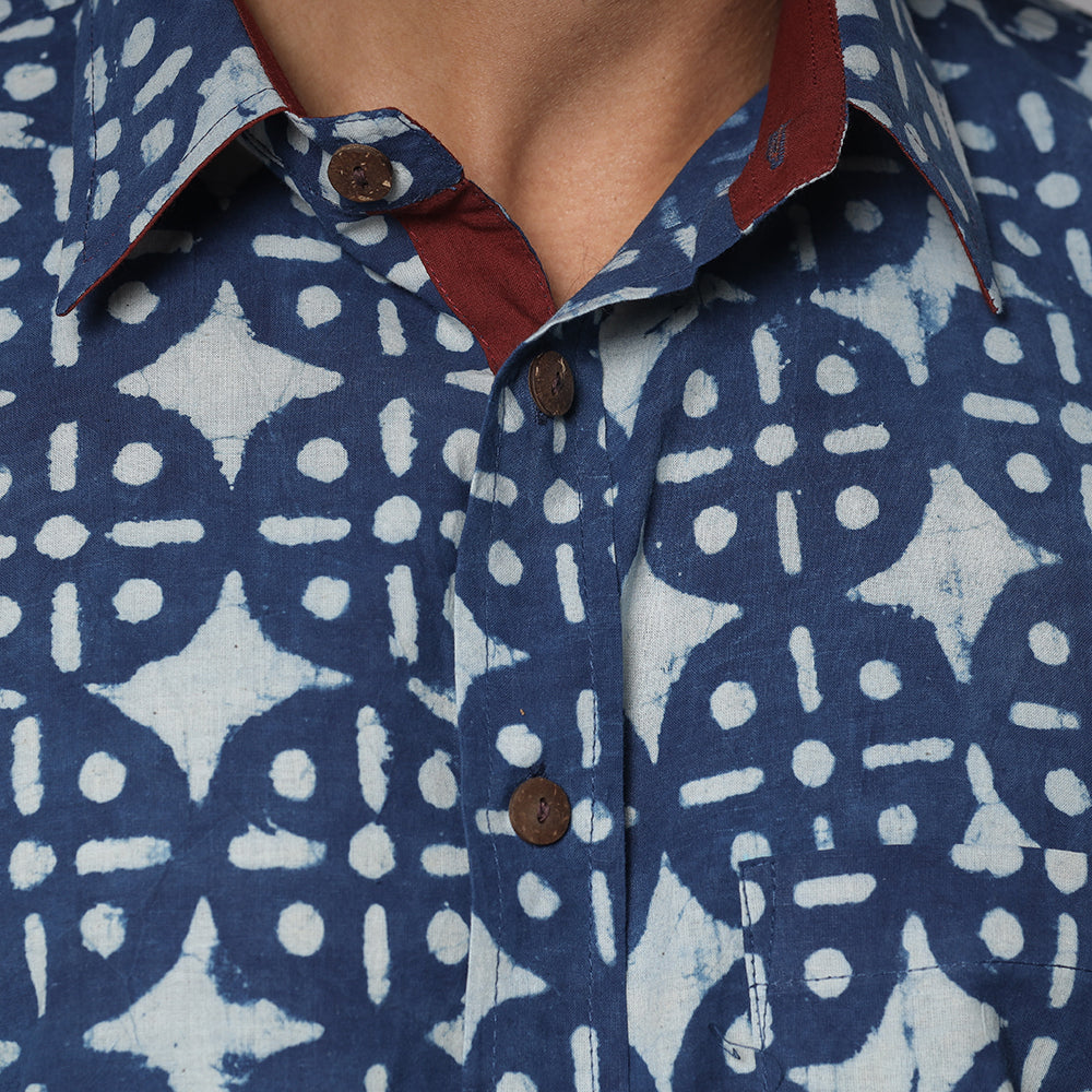 Pure cotton, natural dyed, hand block printed shirt for men. Contemporary designs made through traditional processes, by skilled fourth generation textile printers in Rajasthan. This slow fashion, hand block printed cotton shirt brings back the love for traditional skills, with a modern aesthetic and design.