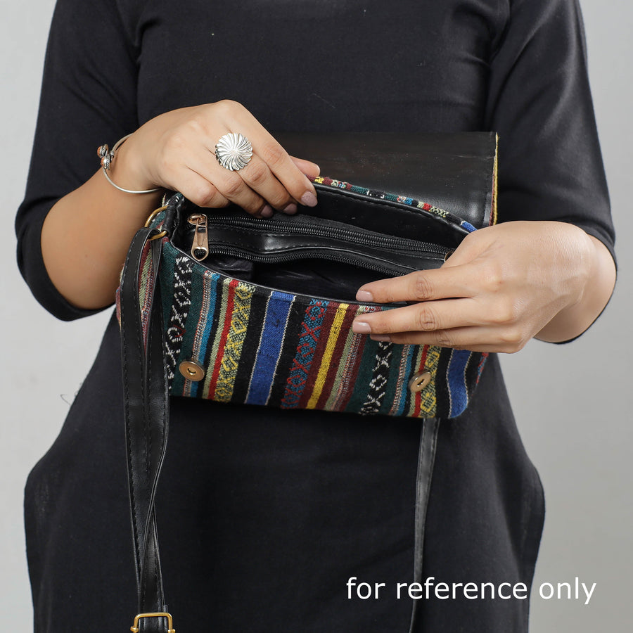 This black handcrafted sling bag with an adjustable sling is made from cotton fabric & rexine. It has ample space to keep most of your essentials.