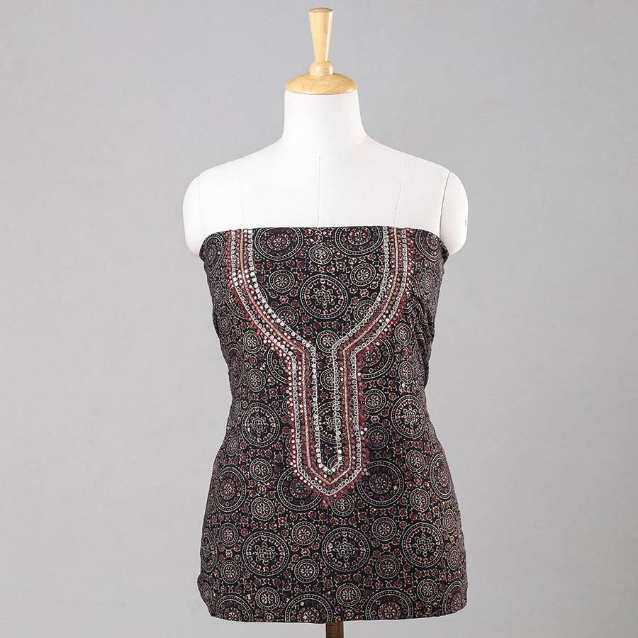 Fine quality sequin and bead work, hand embroidery ajrakh block printing cotton kurta material made using natural dyes through traditional ajrakh technique of hand-block printing practised by the artisans. Ajrakh is a traditional vegetable dyeing and resist block-printing technique on cloth. It is estimated to be around 4,500 years old. The Ajrakh artisans in India are originally from Sindh, and they migrated to Kutch in Gujarat and Barmer in Rajasthan. Ajrakh is the traditional attire of the Maldhari pastoral community of Bhuj. The process of 'Ajrakh' is a long-drawn process with many stages, and each layer of colour is printed after a gap of time, so the cloth has to stay for the day.