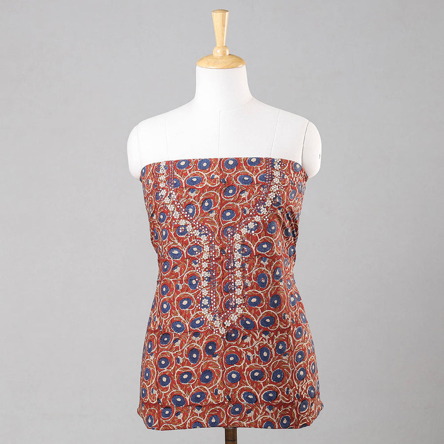 Fine quality zardozi and bead work, hand embroidery, red bagru block printing, cotton kurta material made using natural dyes through traditional mud resist process by using hand carved wooden block practiced in Bagru, Rajasthan.