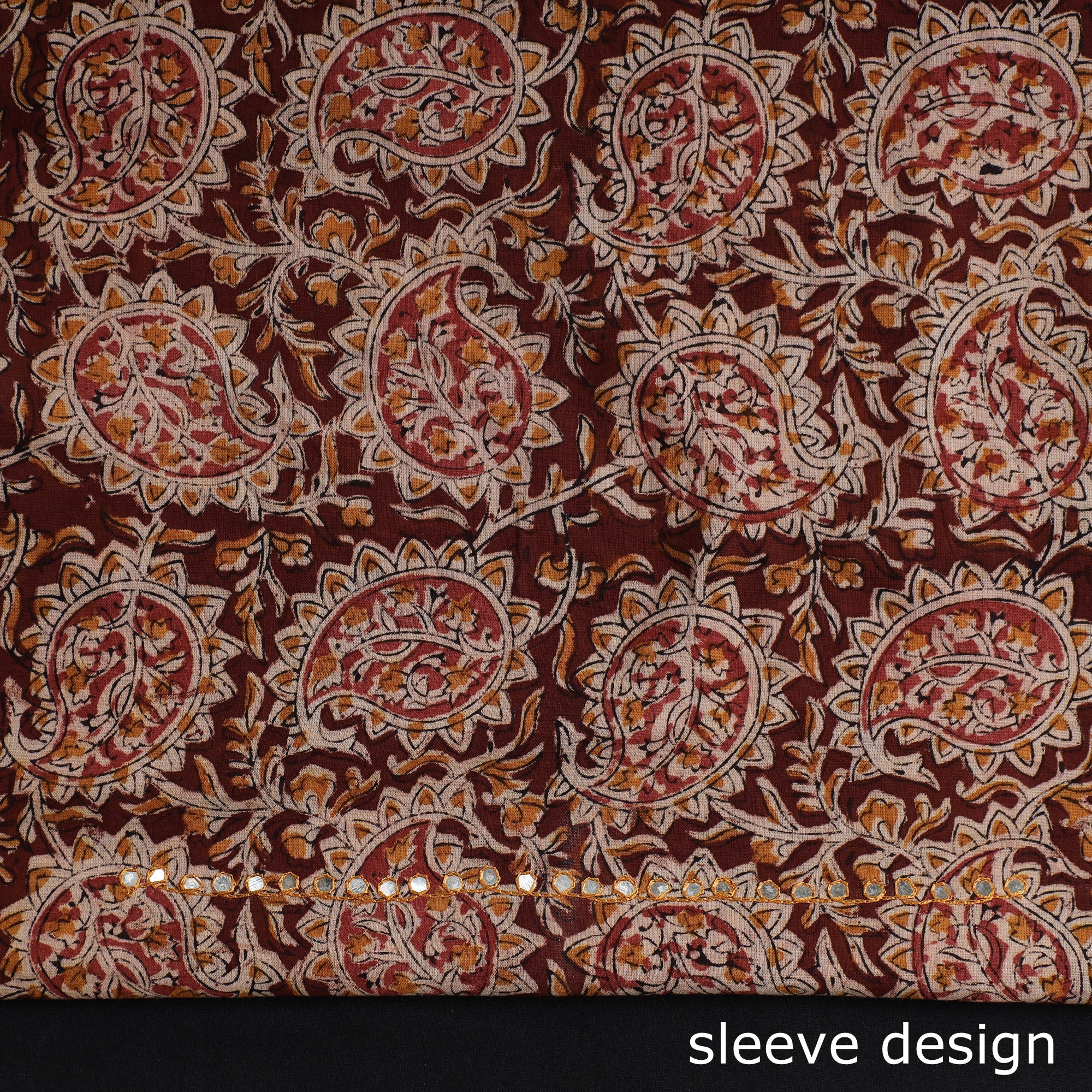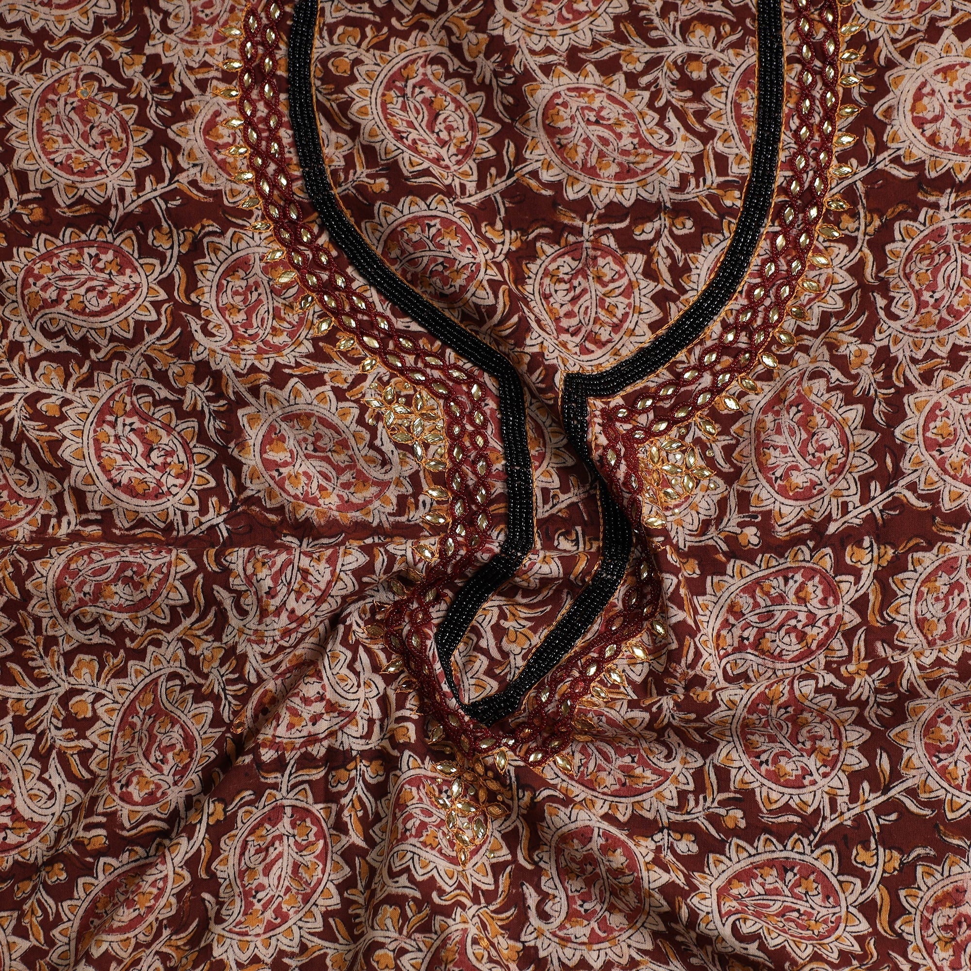 Fine quality bead work, hand embroidery, kalamkari block printing, cotton kurta material made using natural dyes through the traditional process of hand block printing practised by the master artisans. Showcasing an assortment of hand block printed motifs inspired by traditional kalamkari painting. Kalamkari is the earliest and more complex techniques of block-printing.