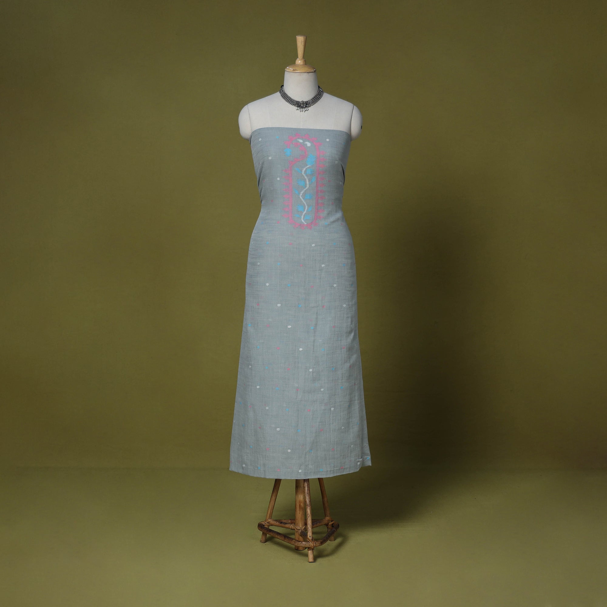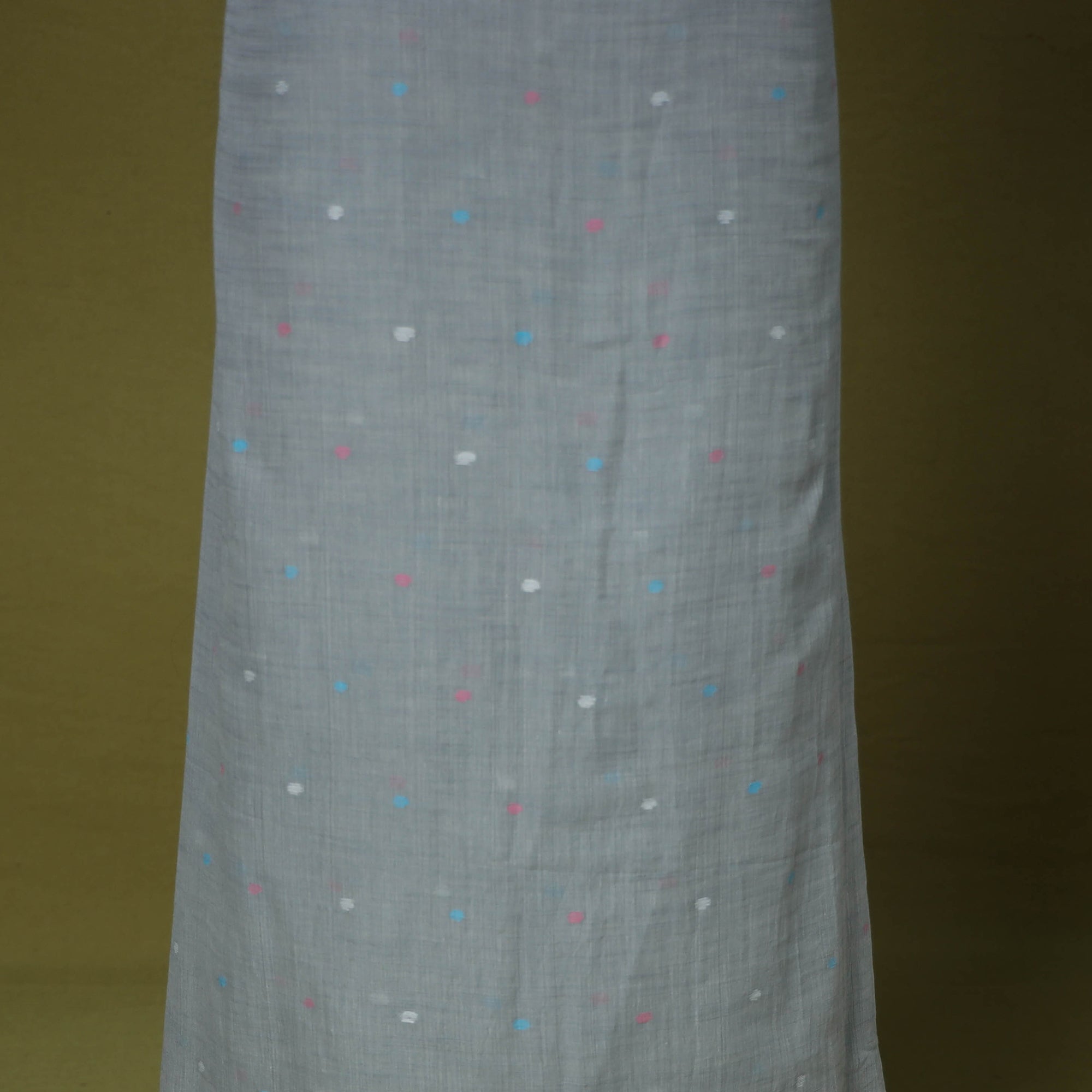 Fine quality grey phulia jamdani weave handloom pure cotton kurta material. Jamdani (extra weft) weaving, a style unique to Bengal…literally like “hand embroidery” on the loom. The method of weaving resembles tapestry work in which small shuttles of coloured, gold or silver threads, are passed through the warp. Jamdani, because of its intricate patterns, has always been a highly expensive product. The process is extremely time consuming as it involves a tedious form of hand looming.