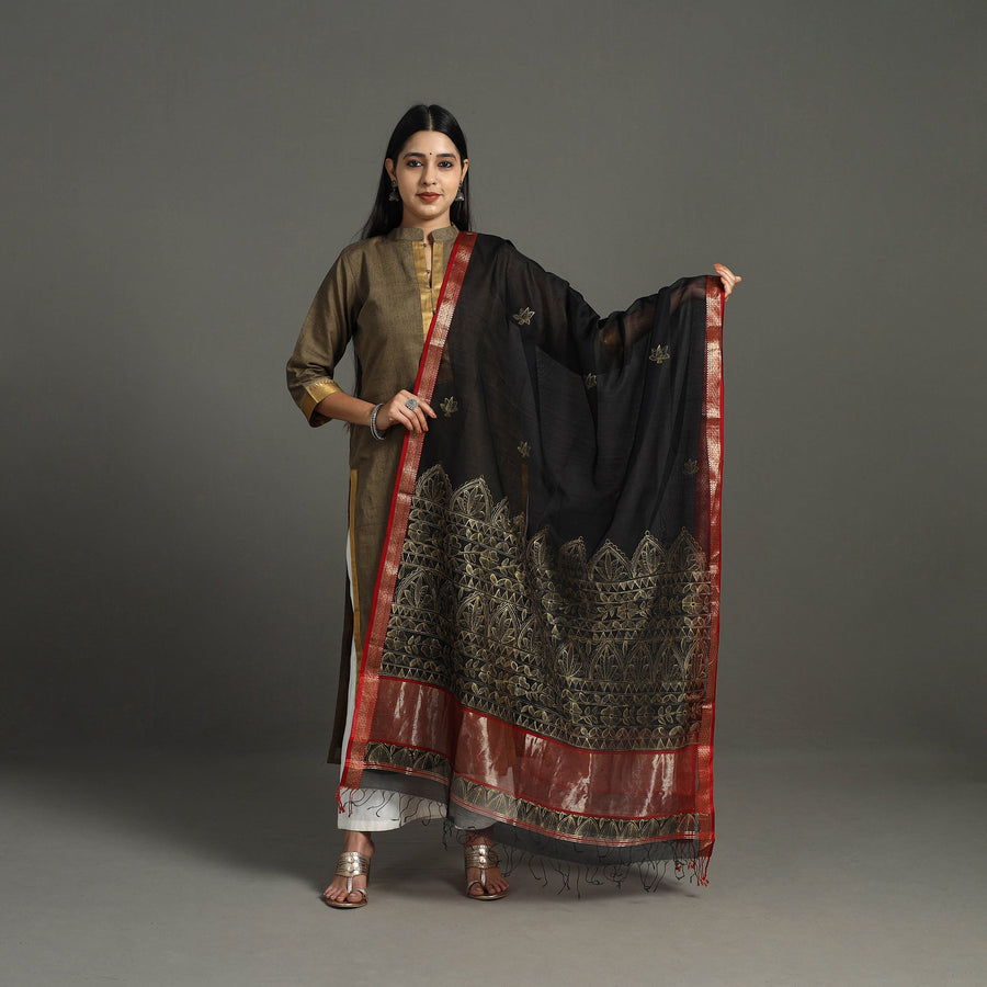 | Material | Black maheshwari silk-cotton dupatta handpainted with original work of madhubani painting done by master artisan Hira Devi from Bihar. It is entirely hand worked using fabric colours. |