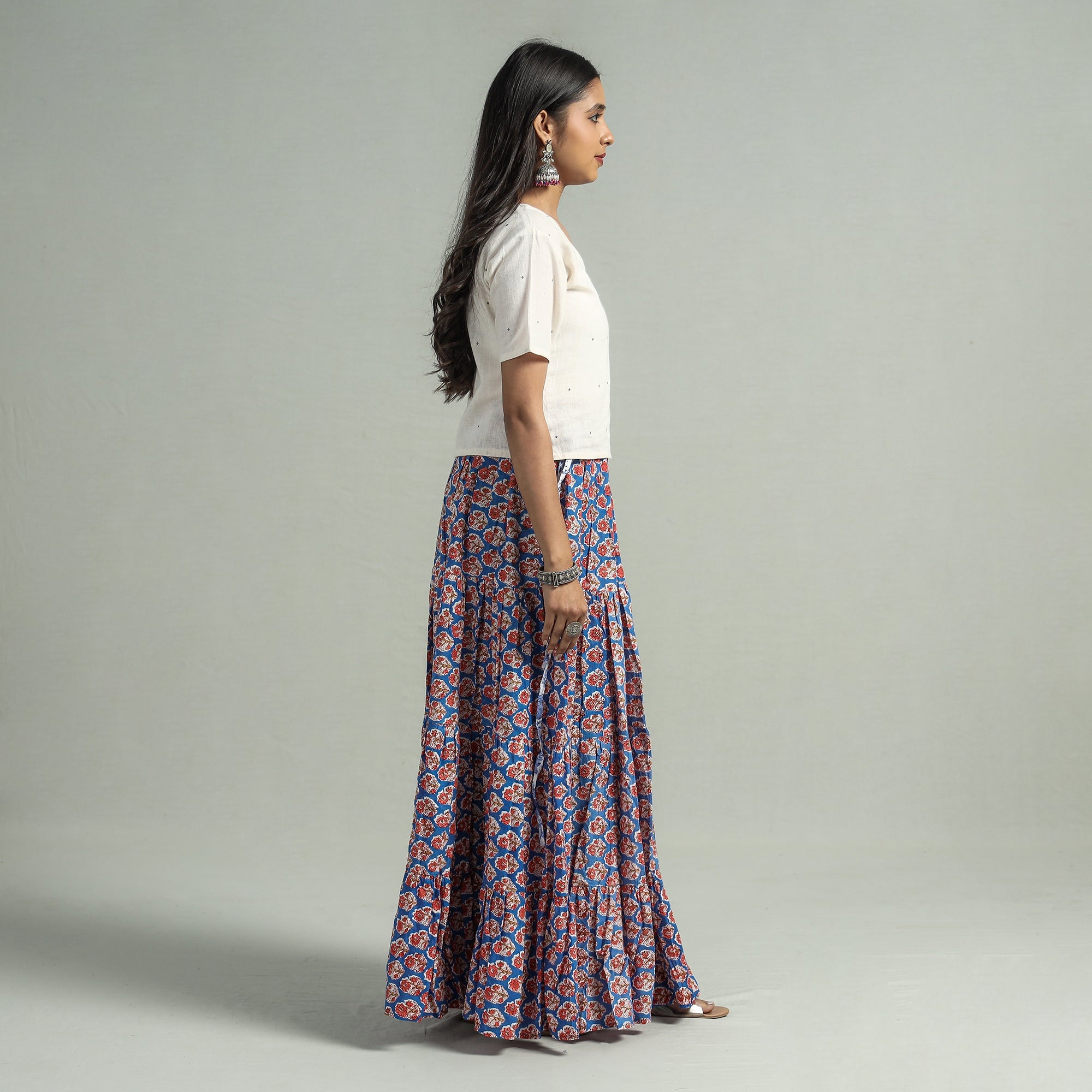 Fine quality blue sanganeri block printing cotton long skirt featuring a waist tie up closure. Sanganeri is a hand-block printing technique originating from Sanganer, a village in the southern part of Jaipur, Rajasthan. Bleed free VAT dyes used.