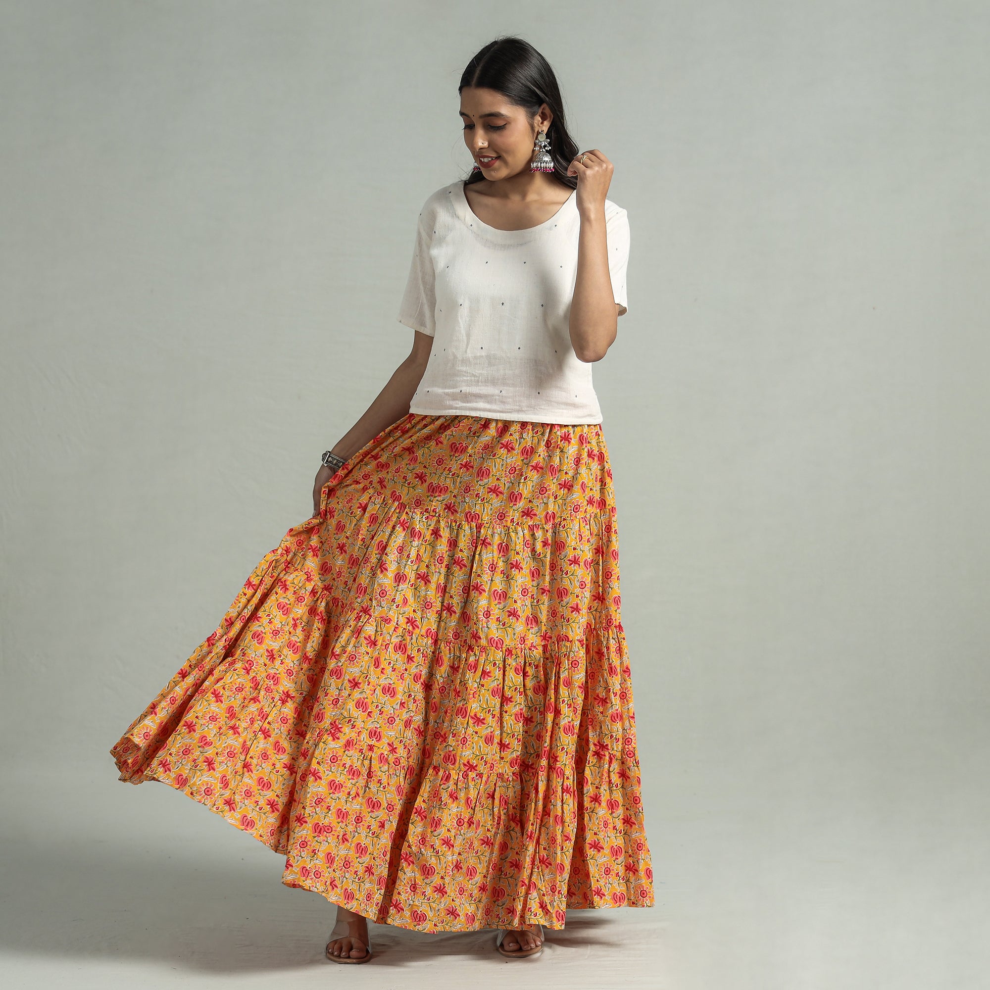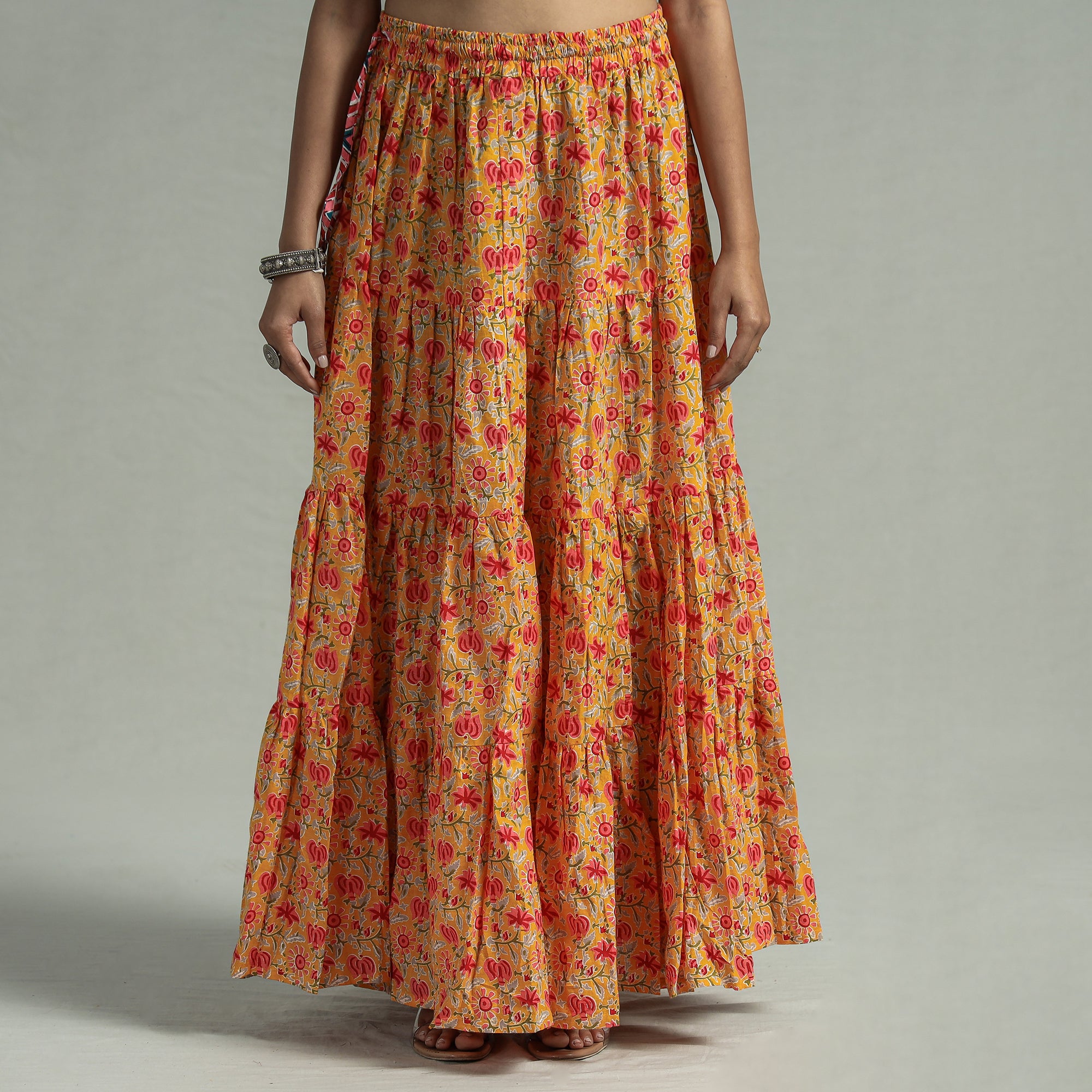 Fine quality yellow sanganeri block printing cotton long skirt featuring a waist tie up closure. Sanganeri is a hand-block printing technique originating from Sanganer, a village in the southern part of Jaipur, Rajasthan. Bleed free VAT dyes used.
