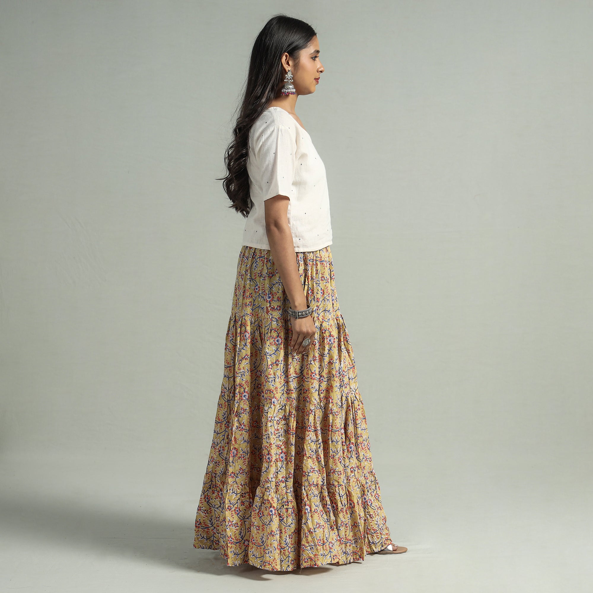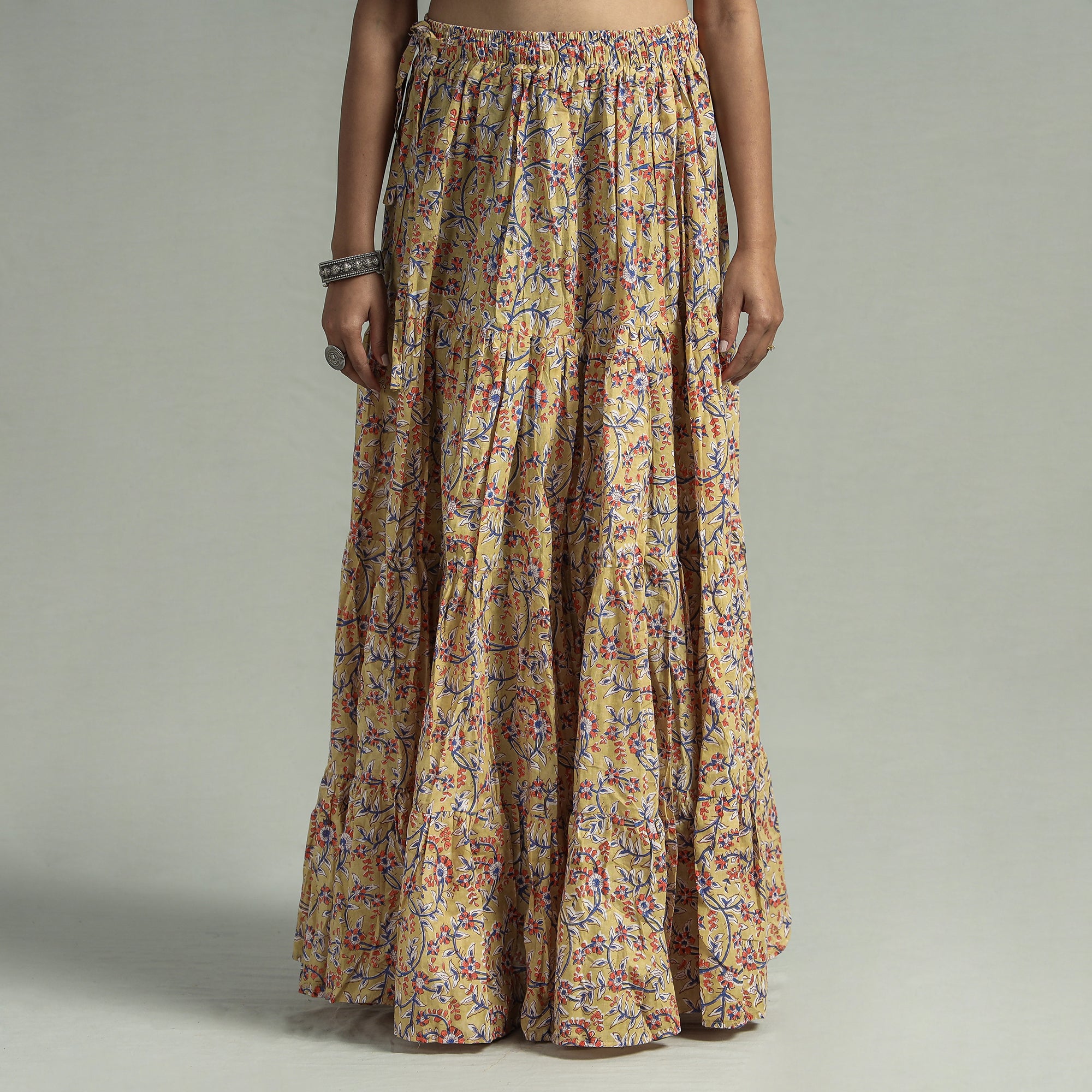 Fine quality yellow sanganeri block printing cotton long skirt featuring a waist tie up closure. Sanganeri is a hand-block printing technique originating from Sanganer, a village in the southern part of Jaipur, Rajasthan. Bleed free VAT dyes used.