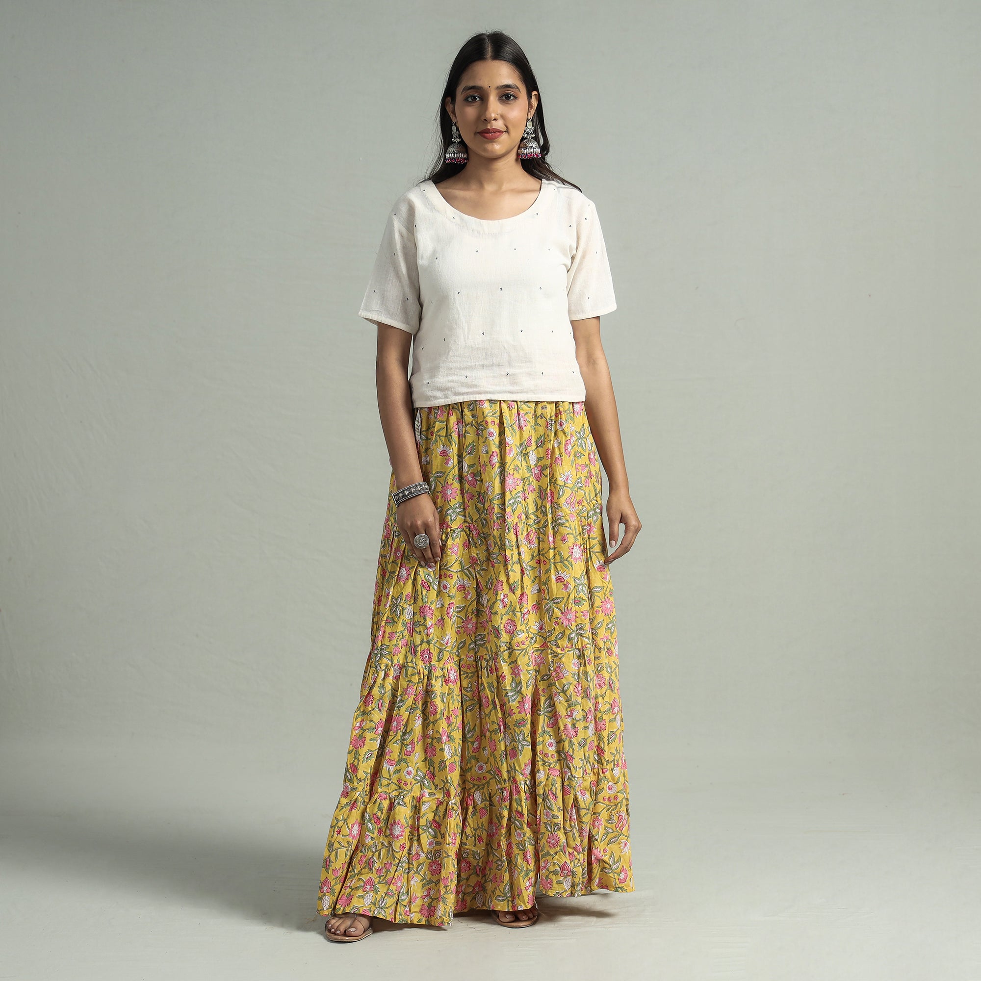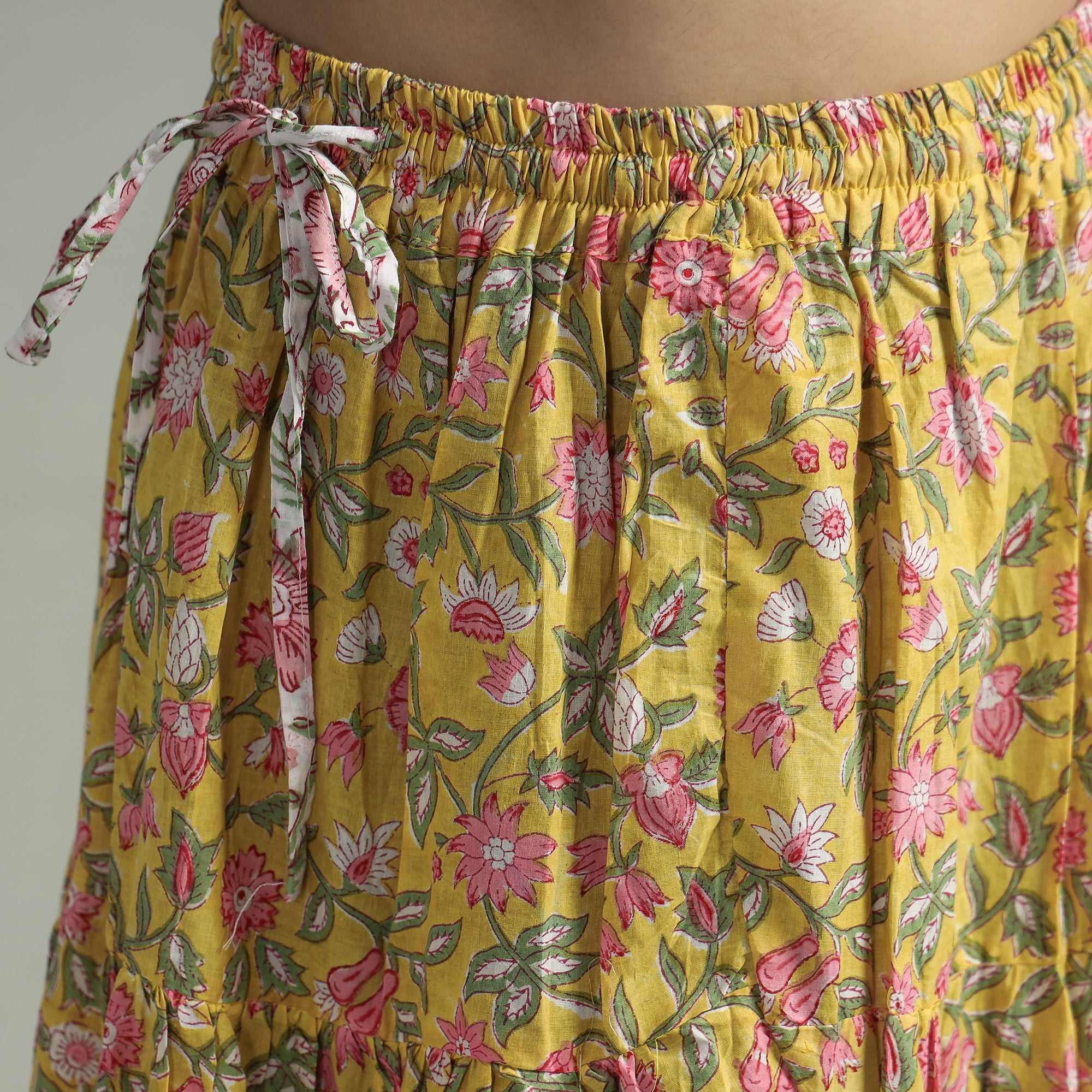 • Yellow - Sanganeri Block Printed Tiered Cotton Long Skirt