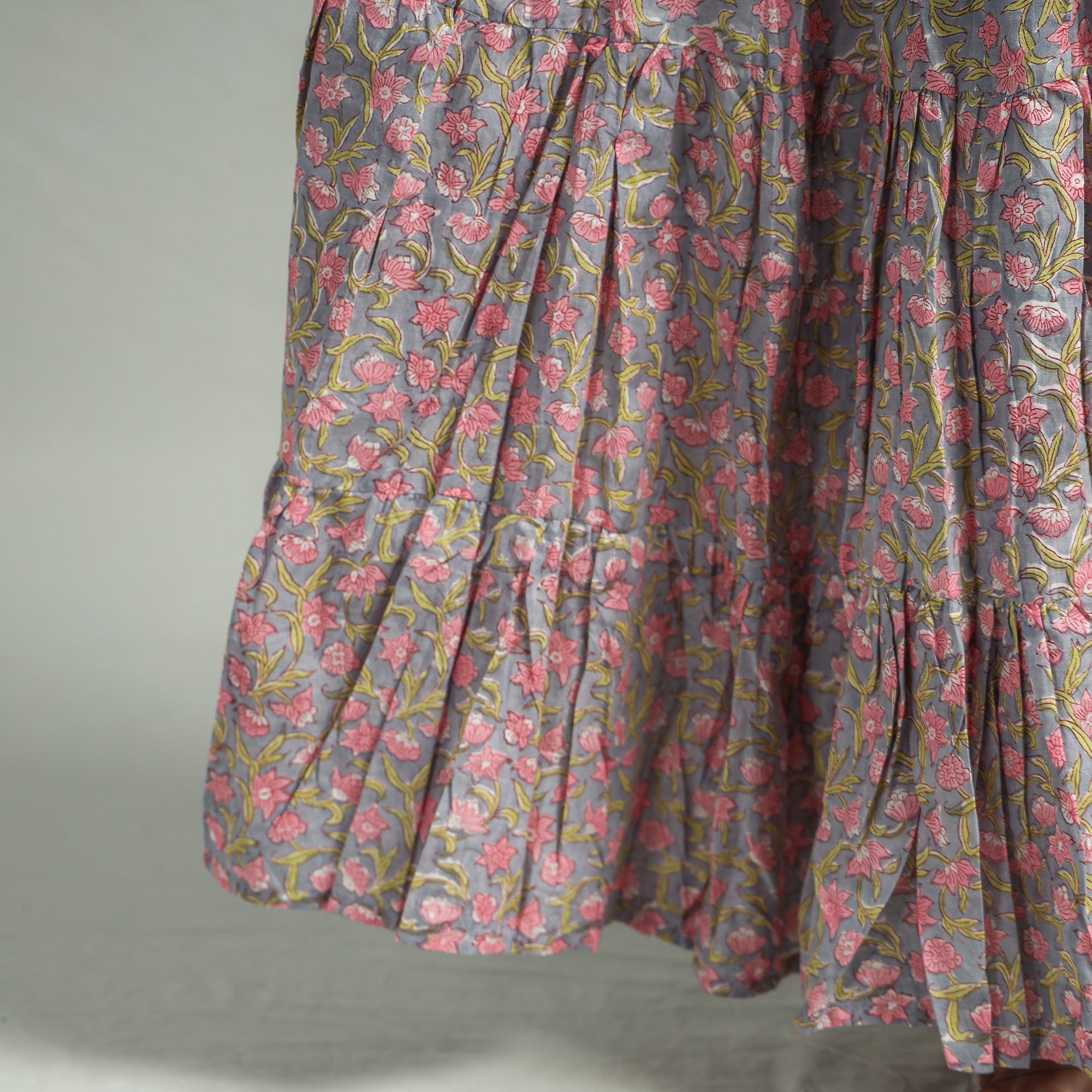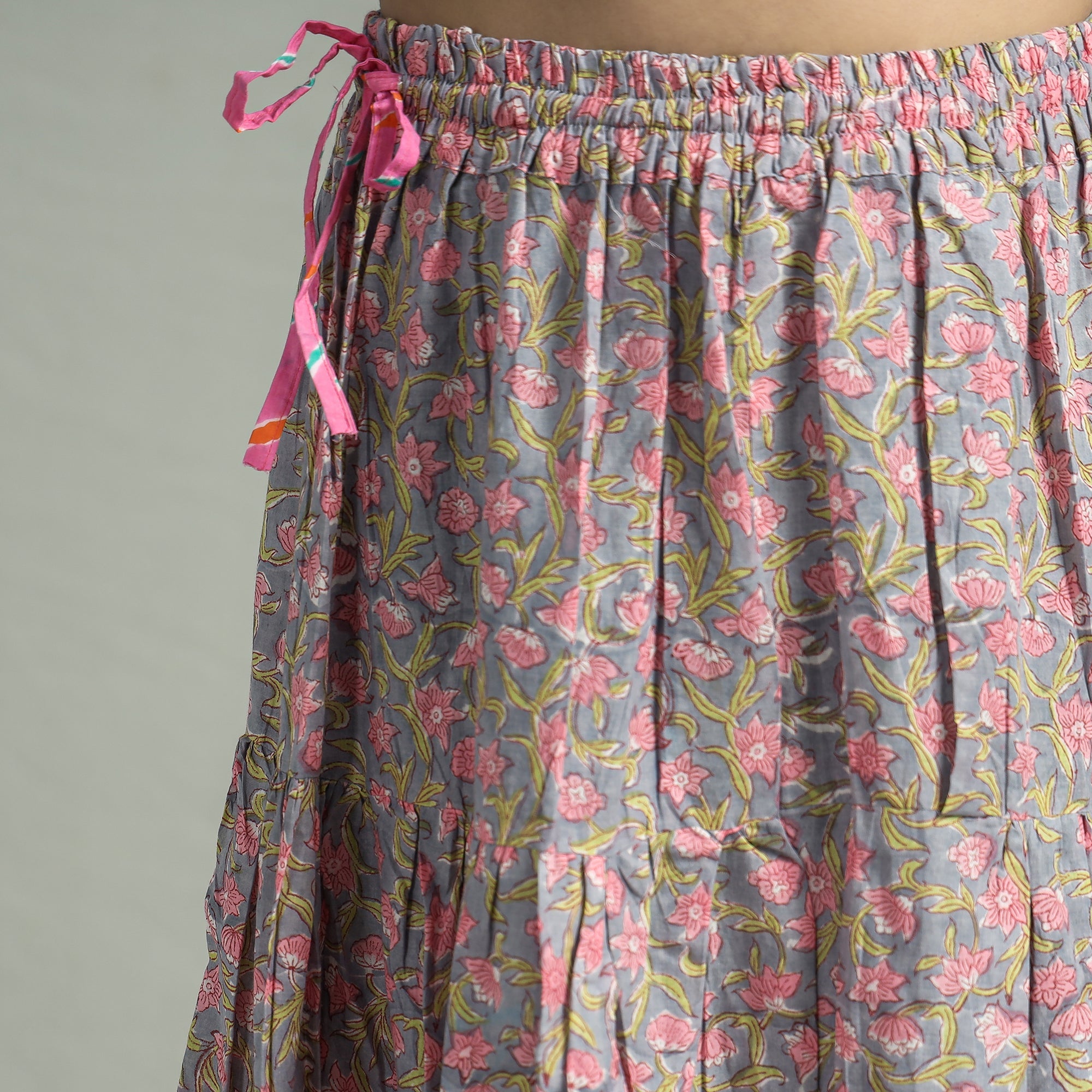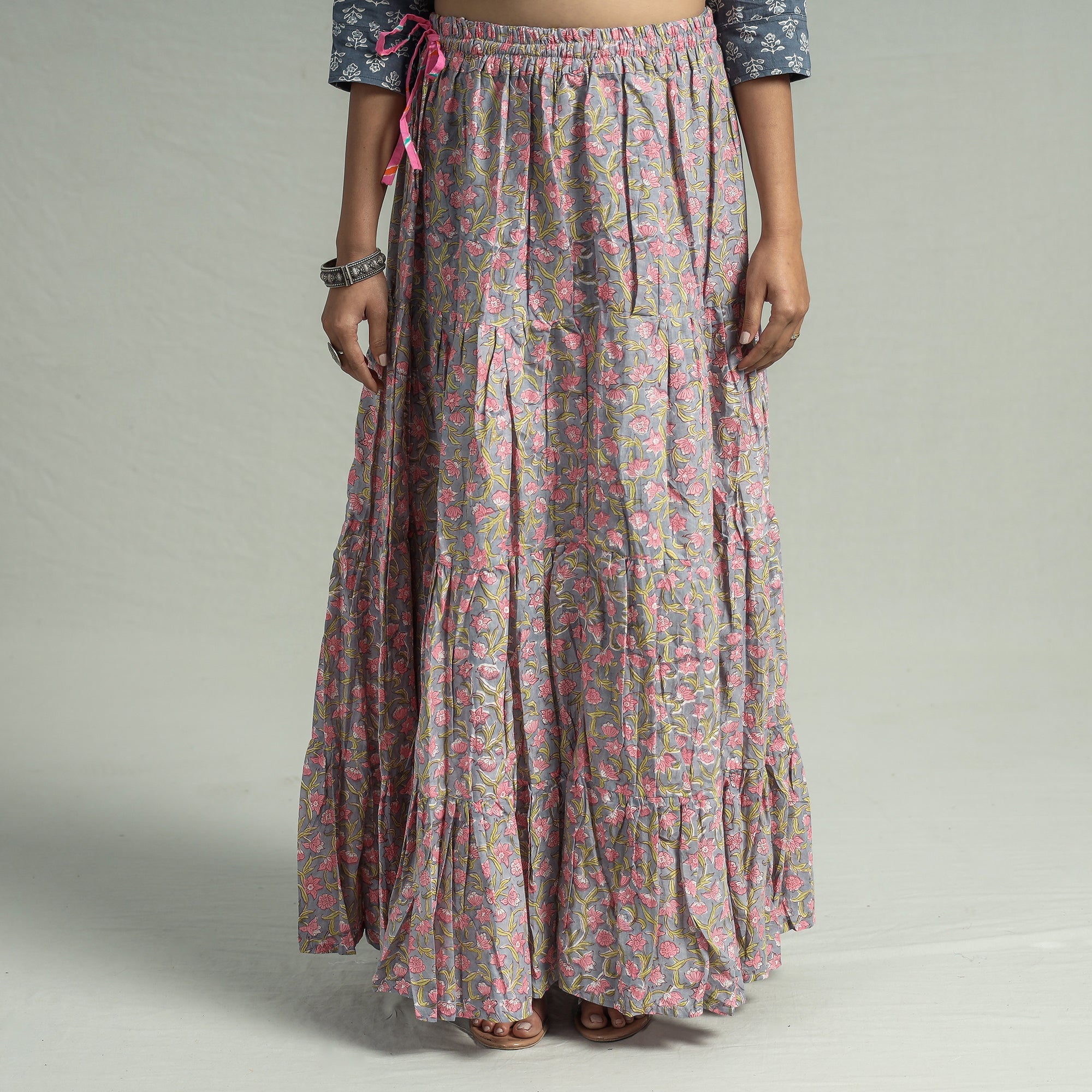Fine quality grey sanganeri block printing cotton long skirt featuring a waist tie up closure. Sanganeri is a hand-block printing technique originating from Sanganer, a village in the southern part of Jaipur, Rajasthan. Bleed free VAT dyes used.