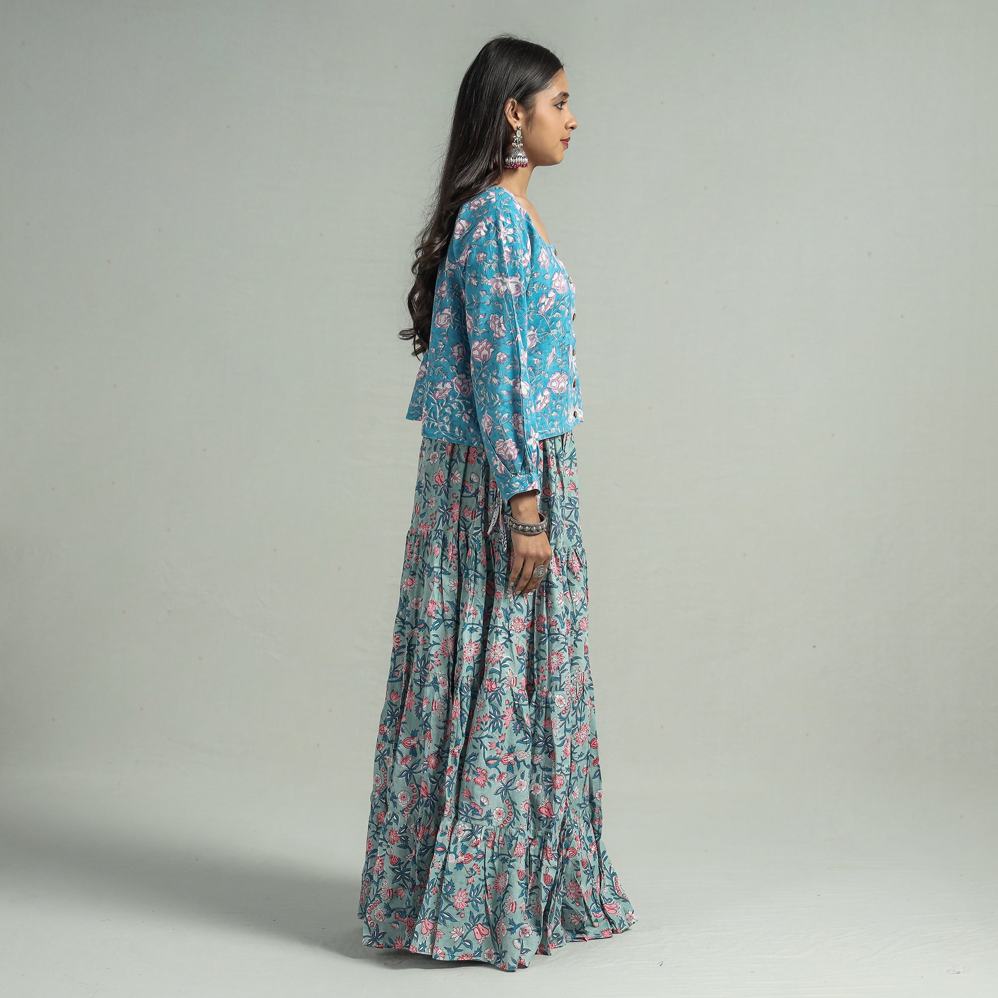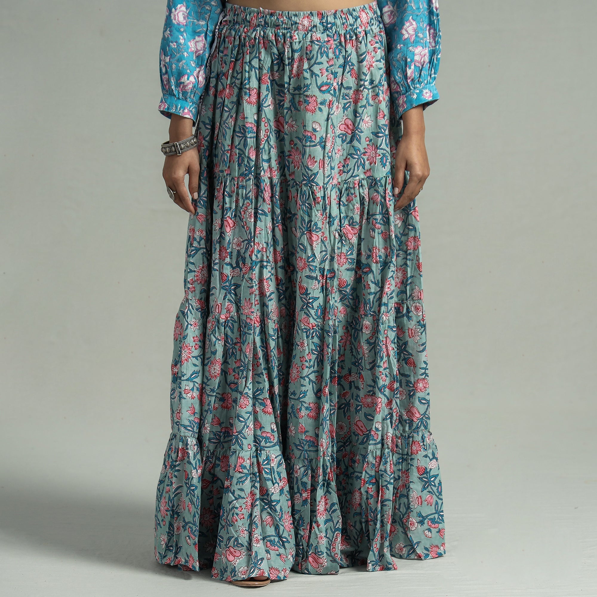 Fine quality blue sanganeri block printing cotton long skirt featuring a waist tie up closure. Sanganeri is a hand-block printing technique originating from Sanganer, a village in the southern part of Jaipur, Rajasthan. Bleed free VAT dyes used.