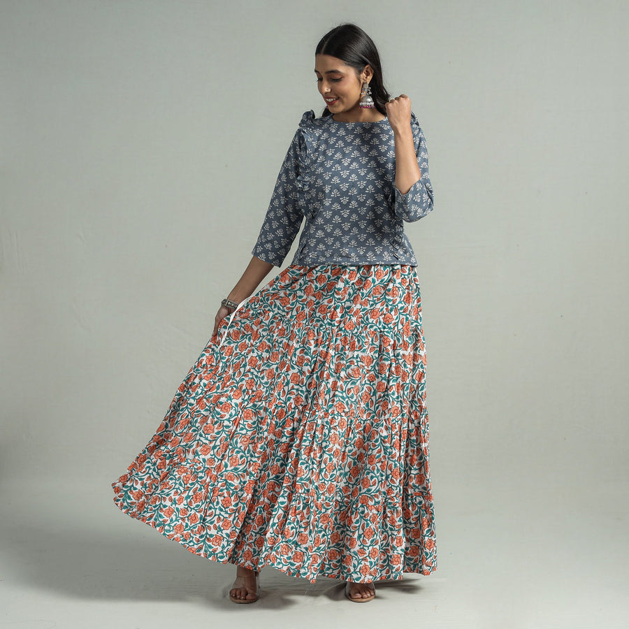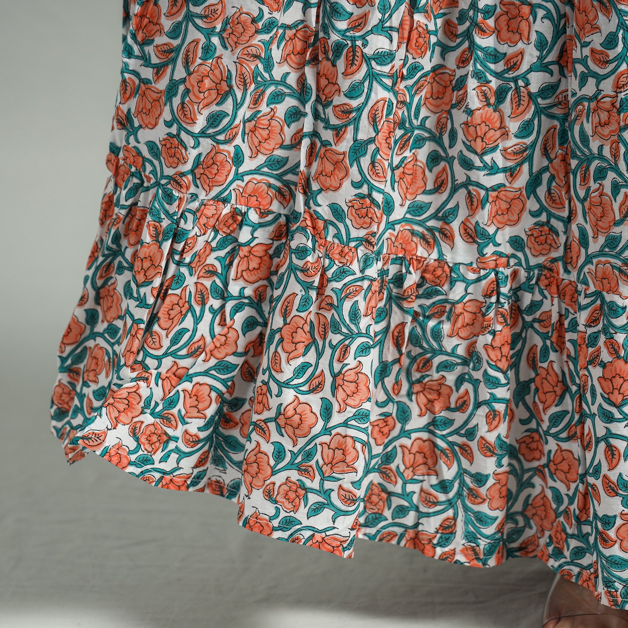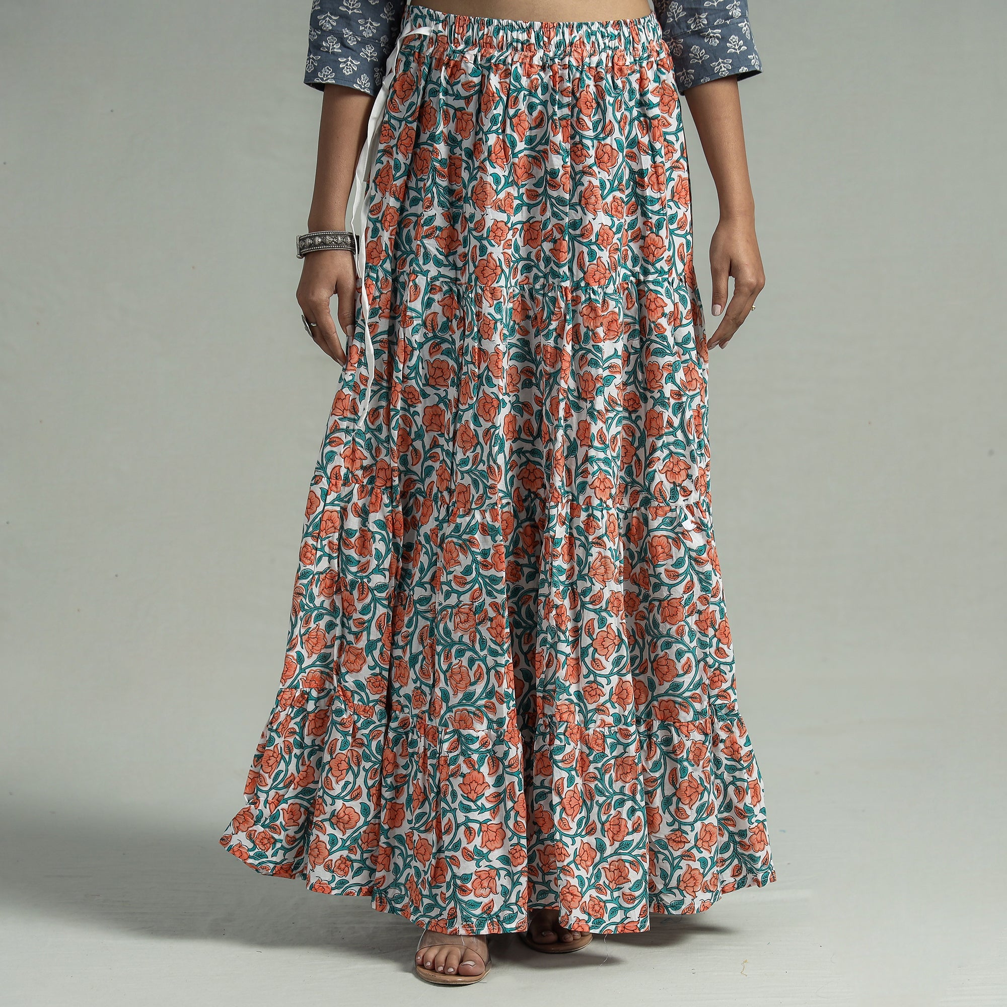 Fine quality sanganeri block printing cotton long skirt featuring a waist tie up closure. Sanganeri is a hand-block printing technique originating from Sanganer, a village in the southern part of Jaipur, Rajasthan. Bleed free VAT dyes used.