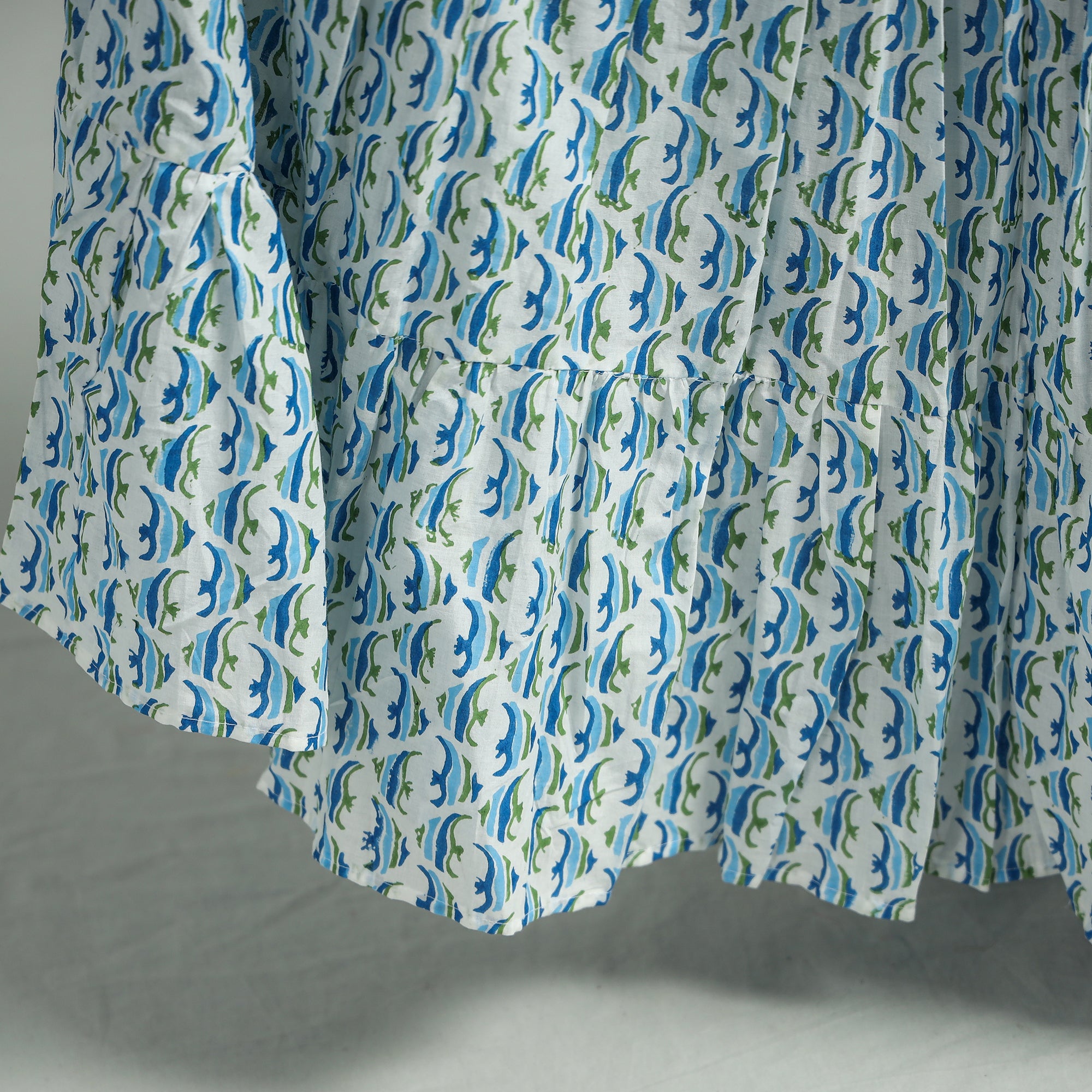 Fine quality blue sanganeri block printing cotton long skirt featuring a waist tie up closure. Sanganeri is a hand-block printing technique originating from Sanganer, a village in the southern part of Jaipur, Rajasthan. Bleed free VAT dyes used.