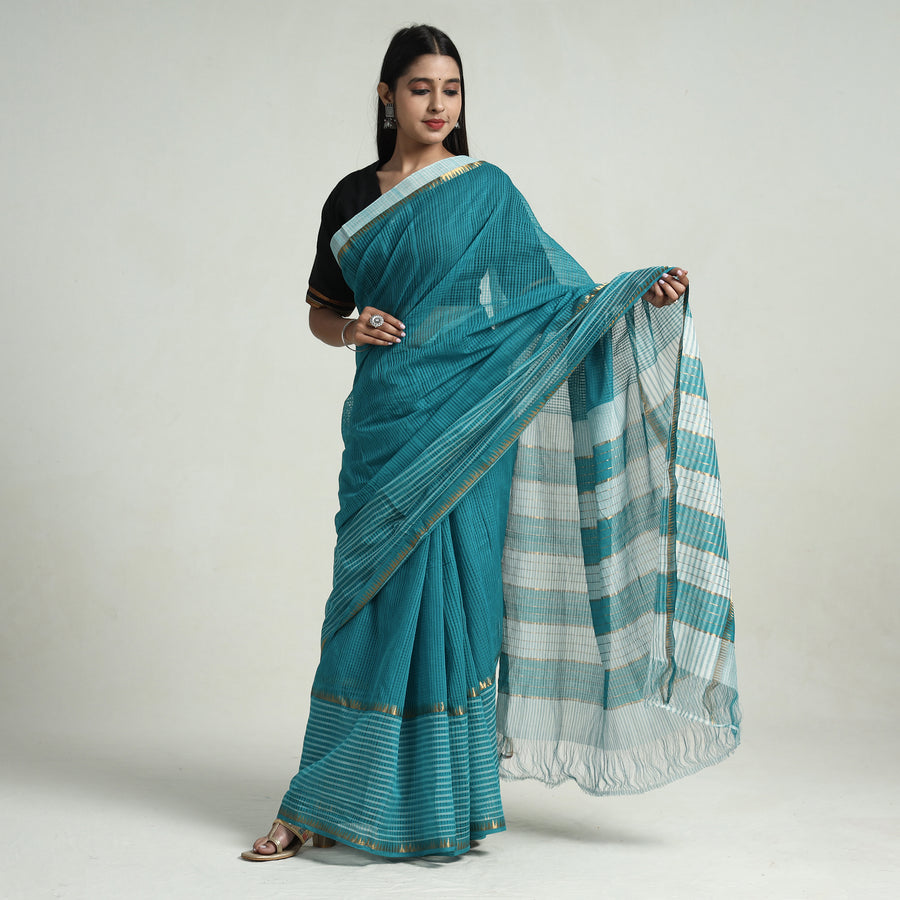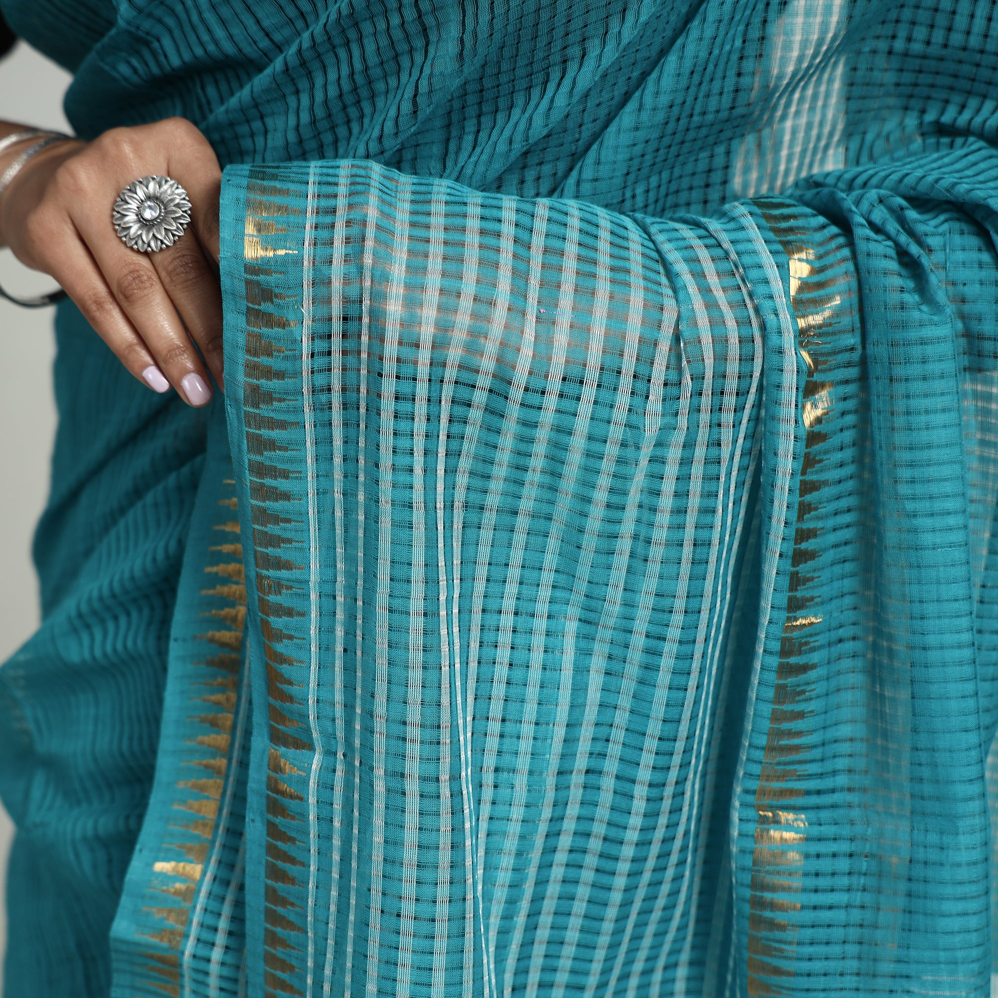 Fine handloom mangalagiri missing checks cotton saree with pochampally ikat blouse piece, that showcases beautiful handloom texture from Andhra Pradesh. Mangalagiri sarees are known for their intricate and rich designs that are simple yet classy. The cotton or silk sarees of Mangalagiri are quite popular among the South Indian women, with the border designs adding a charming elegance.
