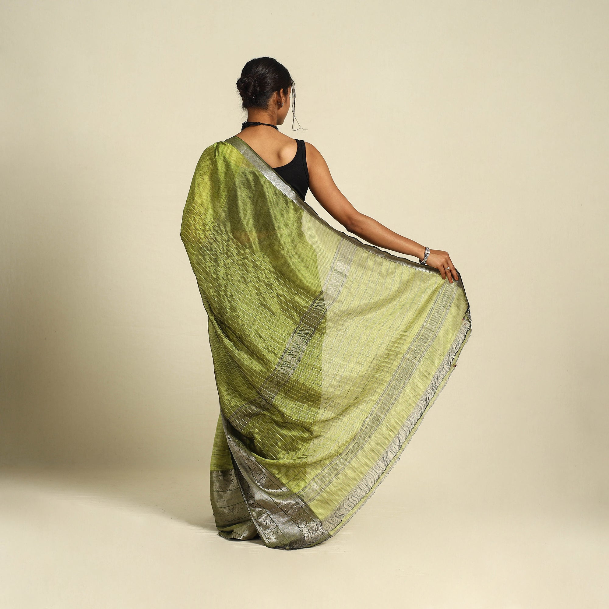 Elevate your wardrobe with our green mangalagiri silk-cotton saree, featuring a zari stripe and border. This handloom beauty, crafted by master artisan Lakshman Rao in Andhra Pradesh, combines tradition with sophistication. Mangalagiri sarees are celebrated for their simple yet rich designs, and this piece exemplifies timeless elegance. Perfect for festive occasions or cultural events, this saree blends comfort with classic style.
