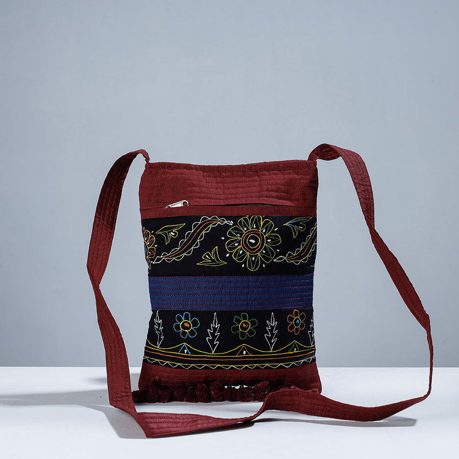 Traditional brown rogan art hand-painted bead & tassels work sling bag with adjustable sling made of silk fabric. It has one zipper pocket outside & inside with silk fabric lining inside, ample space to keep most of your essentials. Made by the master artisan Jabbar Khatri from Nirona in Kutch region of Gujarat.