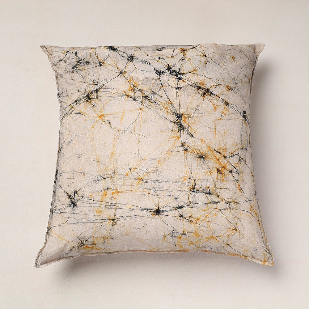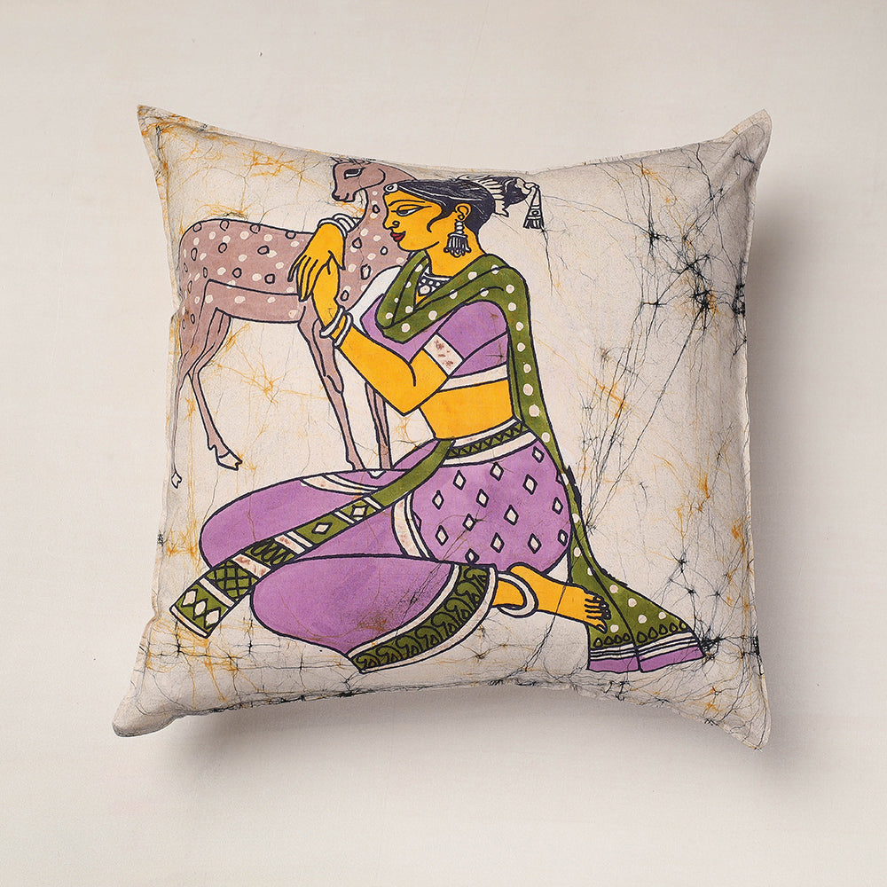Fine quality beige hand batik printing pure cotton cushion cover from Ujjain. Batik is a technique of wax-resist dyeing applied to whole cloth, or cloth made using this technique. The traditional designs and motifs in Indian batik are often passed down from one generation to another.