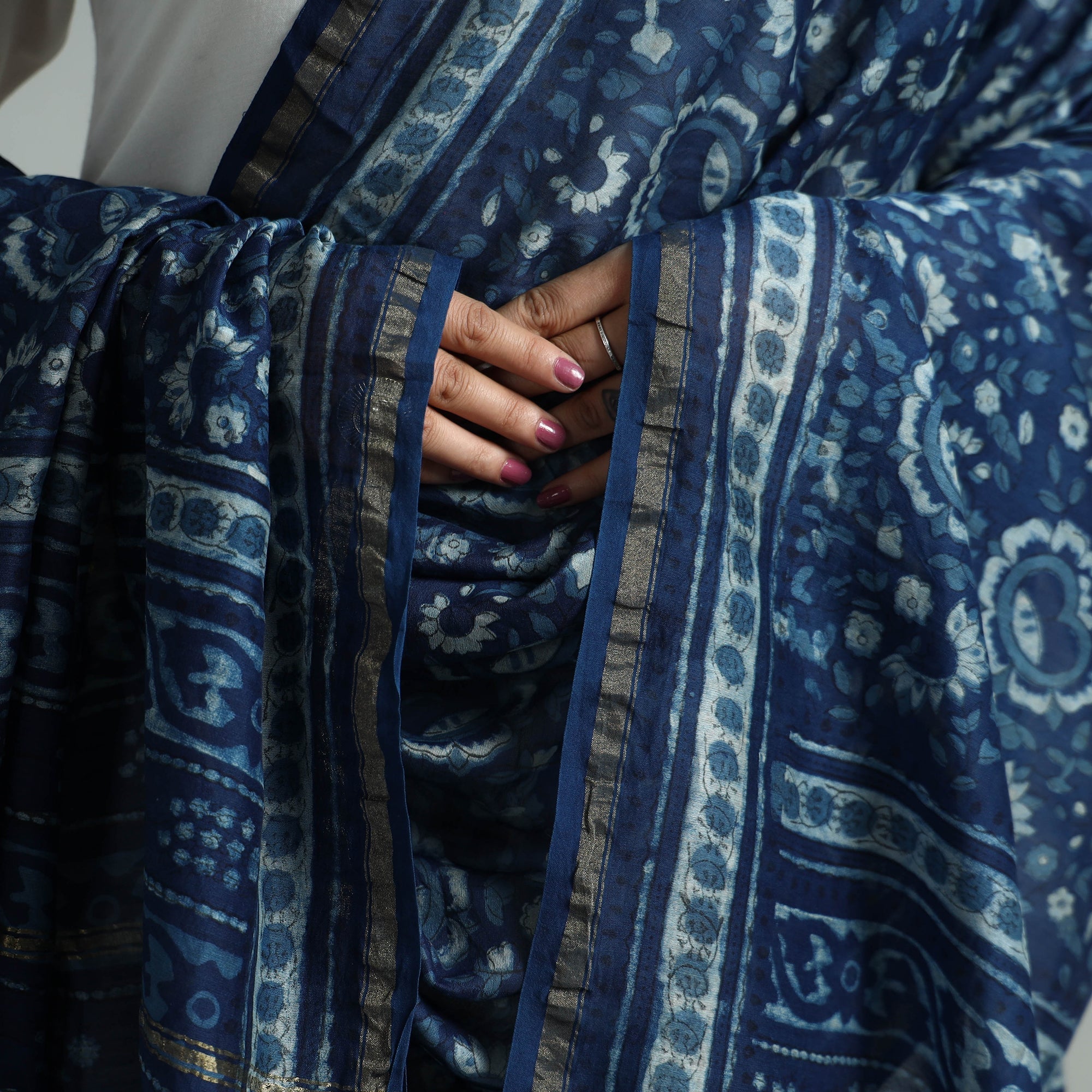 Fine quality akola dabu block printing handloom chanderi silk-cotton dupatta with zari border, made using natural dyes through traditional mud resist process of hand block printing practised by the master artisans in Akola village of Rajasthan. Chanderi silks are known for its gossamer looks and amazing feel.