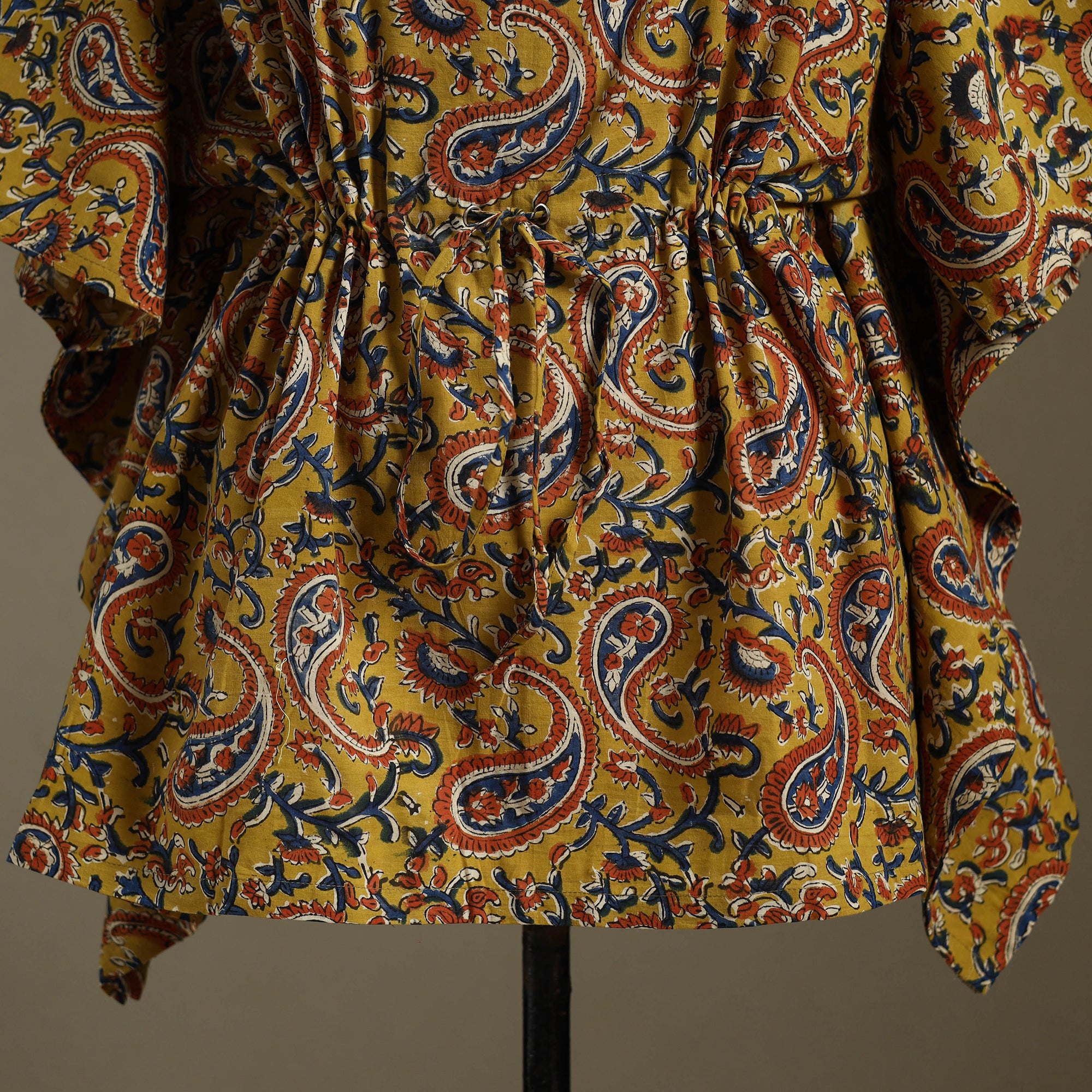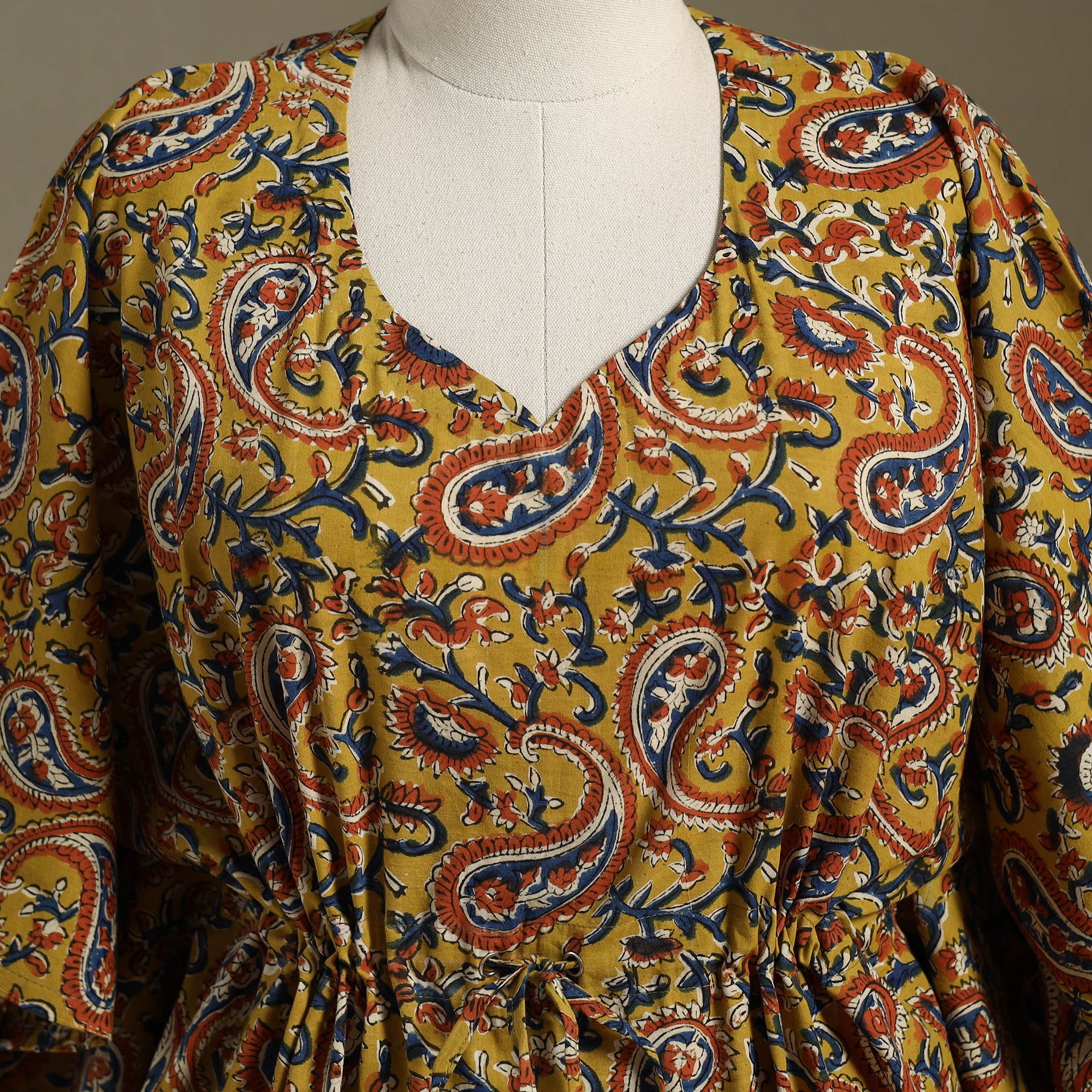 Fine quality sanganeri block printed cotton kaftan with tie-up waist. A traditional kaftan or caftan is an short-length garment with long, flowing sleeves. It has an adjustable drawstring waist. These loose-fitting cotton kaftans are enhanced by a soft touch and beautiful hand prints. This dress will allow you to move with ease and comfort. The drawstring waist tie will give you the freedom to customize the fit to suit your unique shape.