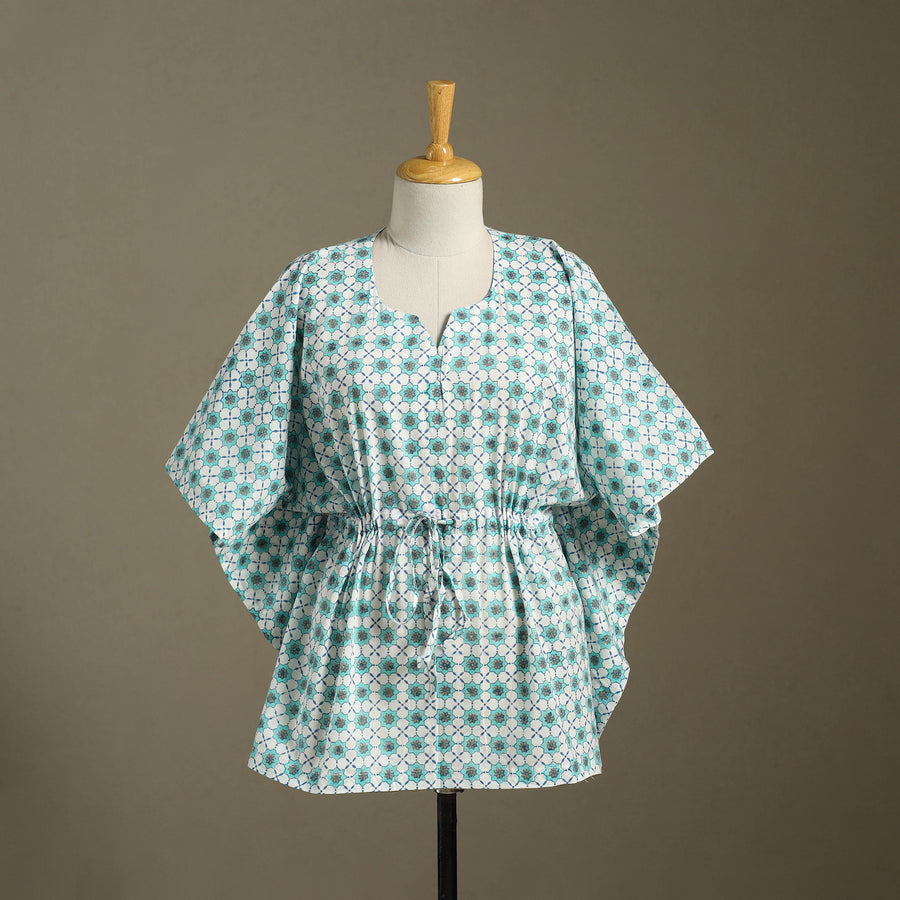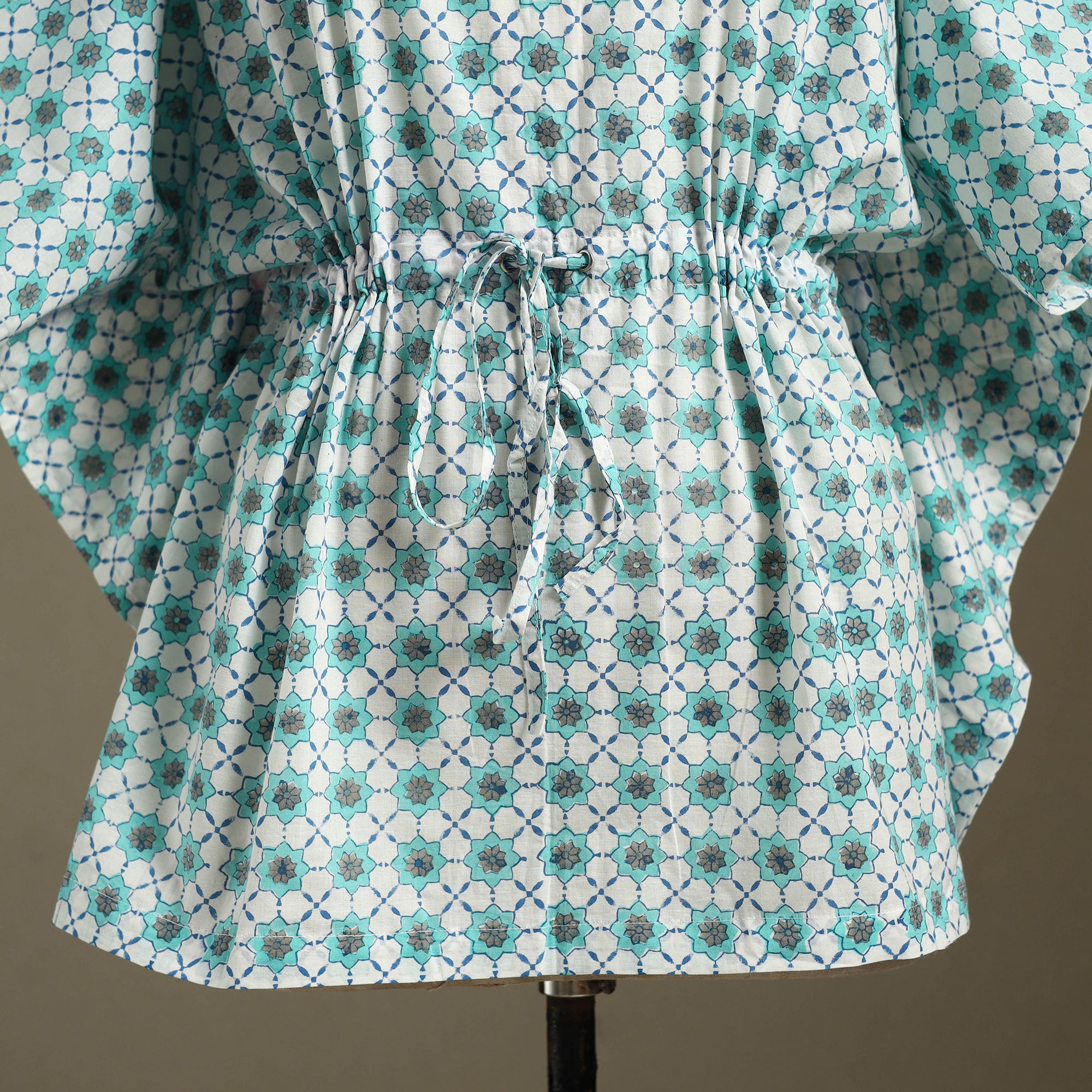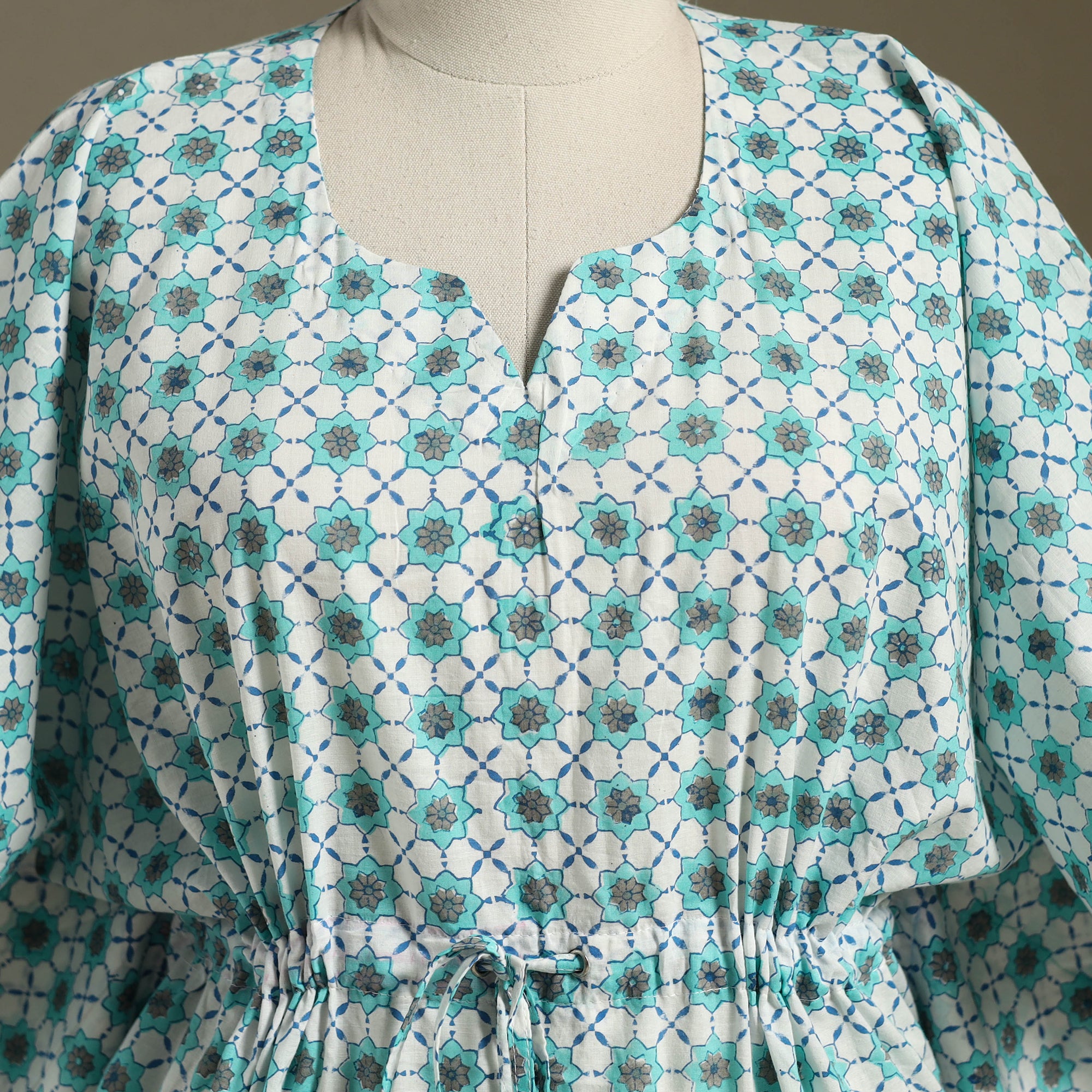 Fine quality blue sanganeri block printed cotton kaftan with tie-up waist. A traditional kaftan or caftan is an short-length garment with long, flowing sleeves. It has an adjustable drawstring waist. These loose-fitting cotton kaftans are enhanced by a soft touch and beautiful hand prints. This dress will allow you to move with ease and comfort. The drawstring waist tie will give you the freedom to customize the fit to suit your unique shape.