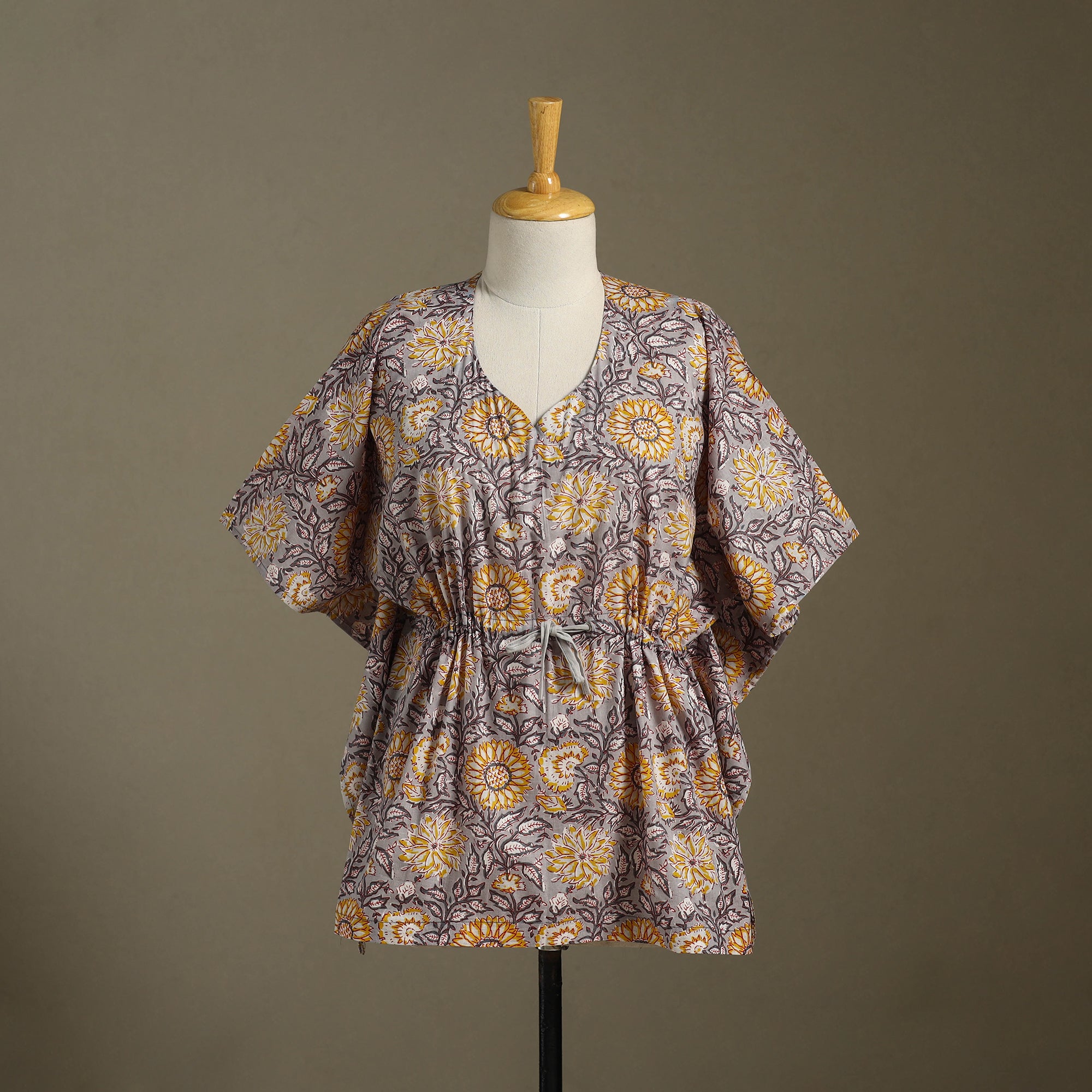 Fine quality sanganeri block printed cotton kaftan with tie-up waist. A traditional kaftan or caftan is an short-length garment with long, flowing sleeves. It has an adjustable drawstring waist. These loose-fitting cotton kaftans are enhanced by a soft touch and beautiful hand prints. This dress will allow you to move with ease and comfort. The drawstring waist tie will give you the freedom to customize the fit to suit your unique shape.
