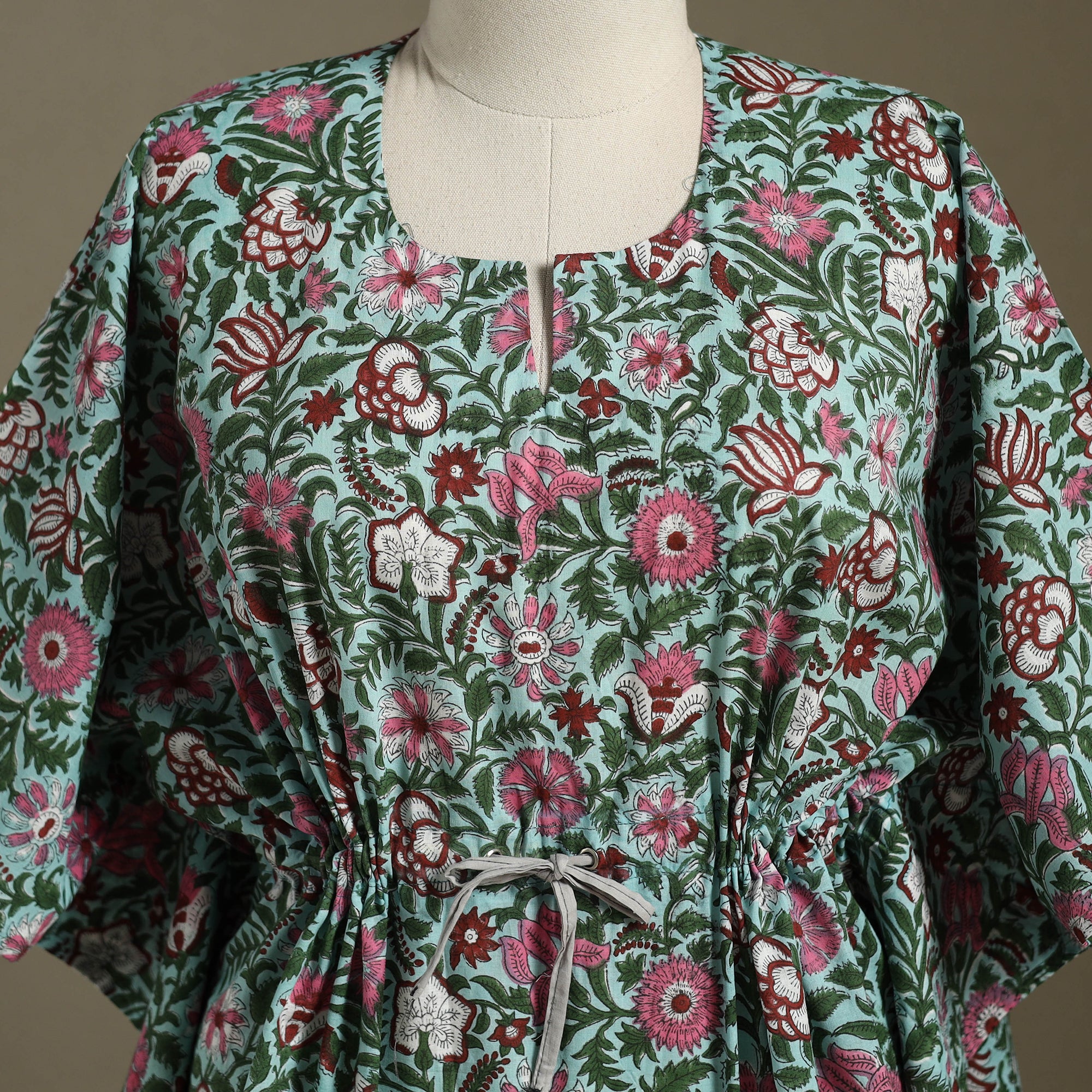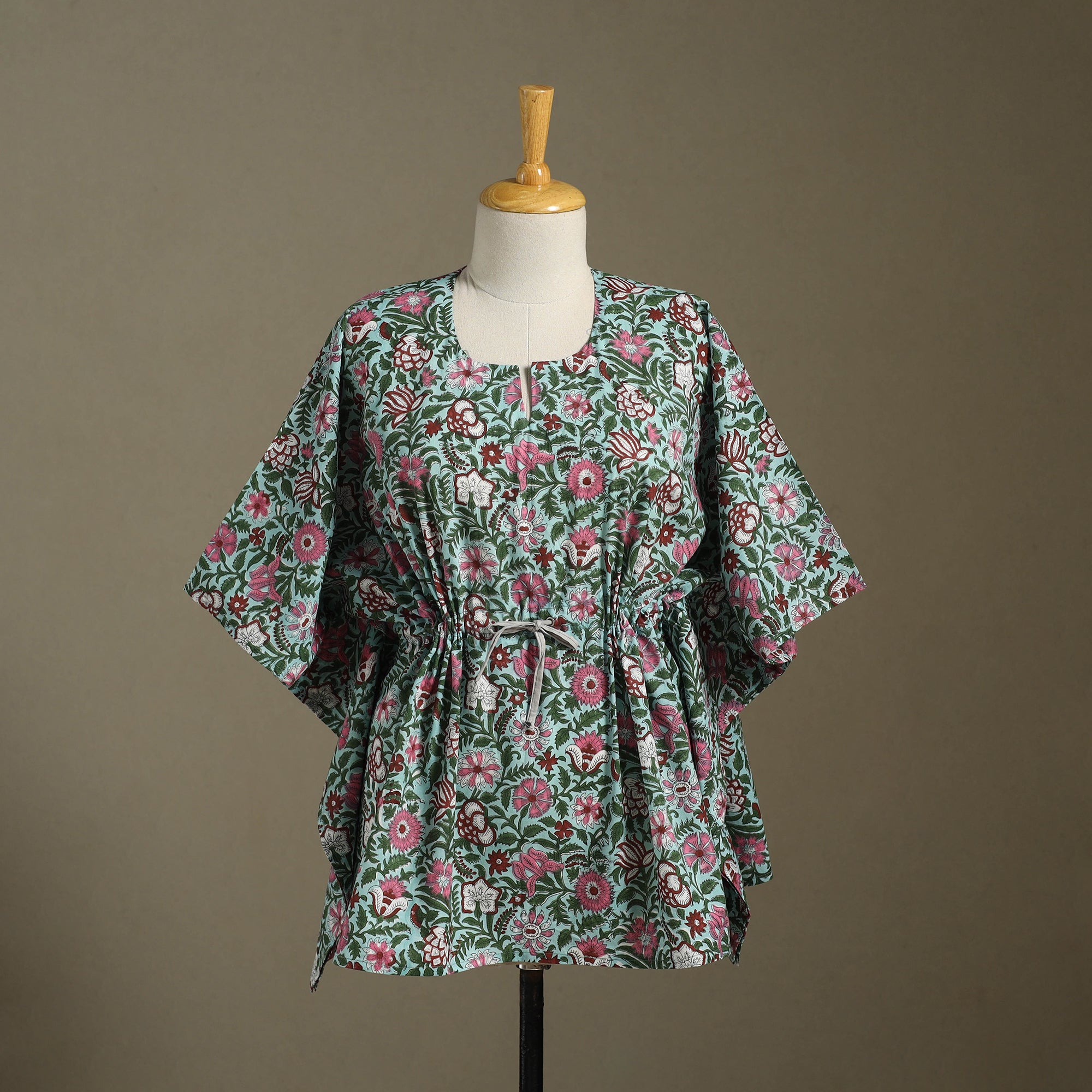 Fine quality sanganeri block printed cotton kaftan with tie-up waist. A traditional kaftan or caftan is an short-length garment with long, flowing sleeves. It has an adjustable drawstring waist. These loose-fitting cotton kaftans are enhanced by a soft touch and beautiful hand prints. This dress will allow you to move with ease and comfort. The drawstring waist tie will give you the freedom to customize the fit to suit your unique shape.