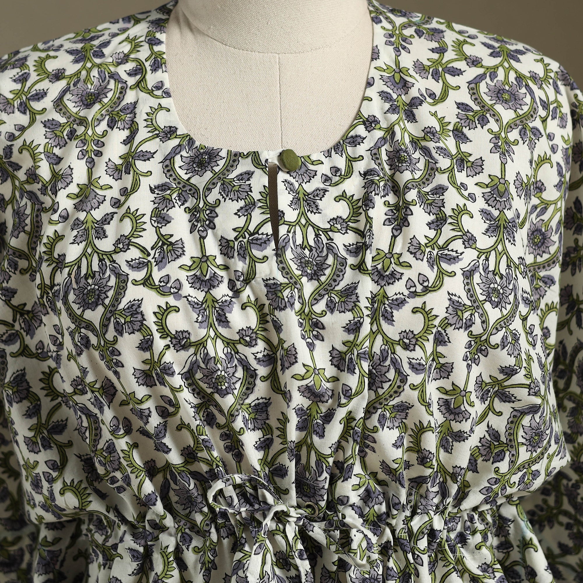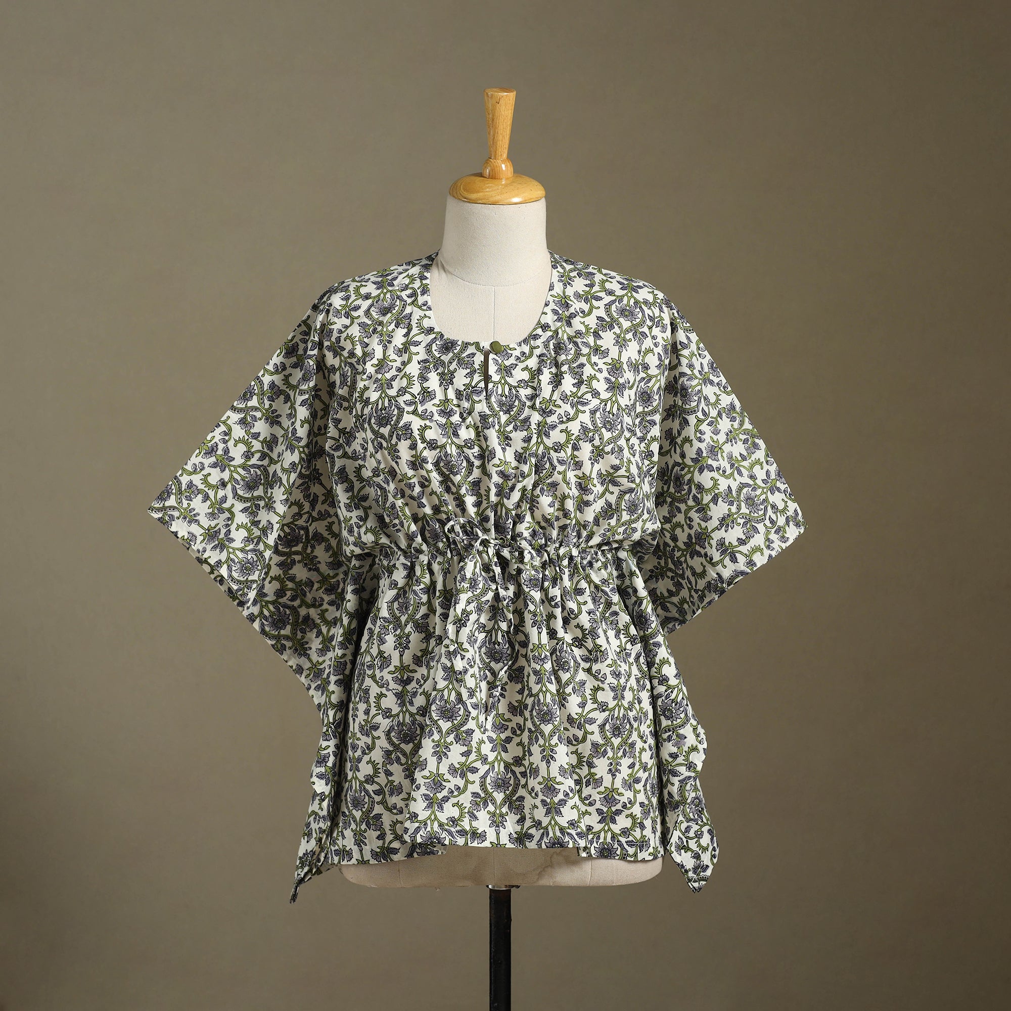 Fine quality sanganeri block printed cotton kaftan with tie-up waist. A traditional kaftan or caftan is an short-length garment with long, flowing sleeves. It has an adjustable drawstring waist. These loose-fitting cotton kaftans are enhanced by a soft touch and beautiful hand prints. This dress will allow you to move with ease and comfort. The drawstring waist tie will give you the freedom to customize the fit to suit your unique shape.