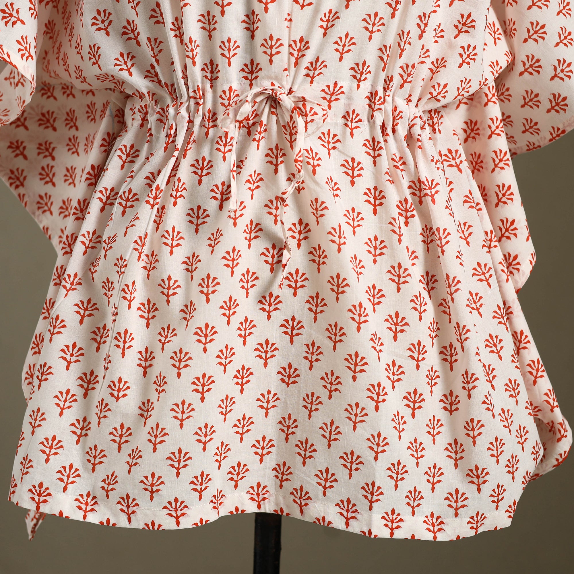 Fine quality sanganeri block printed cotton kaftan with tie-up waist. A traditional kaftan or caftan is an short-length garment with long, flowing sleeves. It has an adjustable drawstring waist. These loose-fitting cotton kaftans are enhanced by a soft touch and beautiful hand prints. This dress will allow you to move with ease and comfort. The drawstring waist tie will give you the freedom to customize the fit to suit your unique shape.