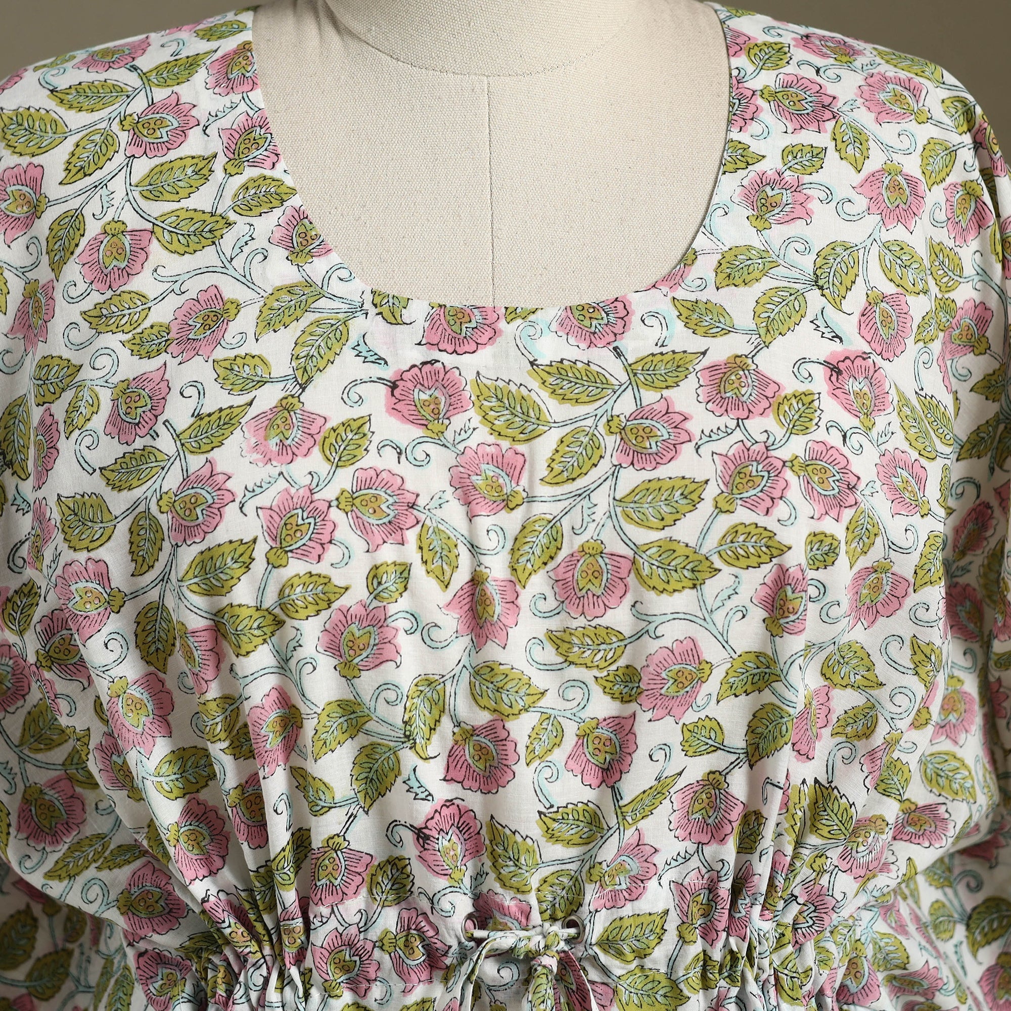 Fine quality sanganeri block printed cotton kaftan with tie-up waist. A traditional kaftan or caftan is an short-length garment with long, flowing sleeves. It has an adjustable drawstring waist. These loose-fitting cotton kaftans are enhanced by a soft touch and beautiful hand prints. This dress will allow you to move with ease and comfort. The drawstring waist tie will give you the freedom to customize the fit to suit your unique shape.