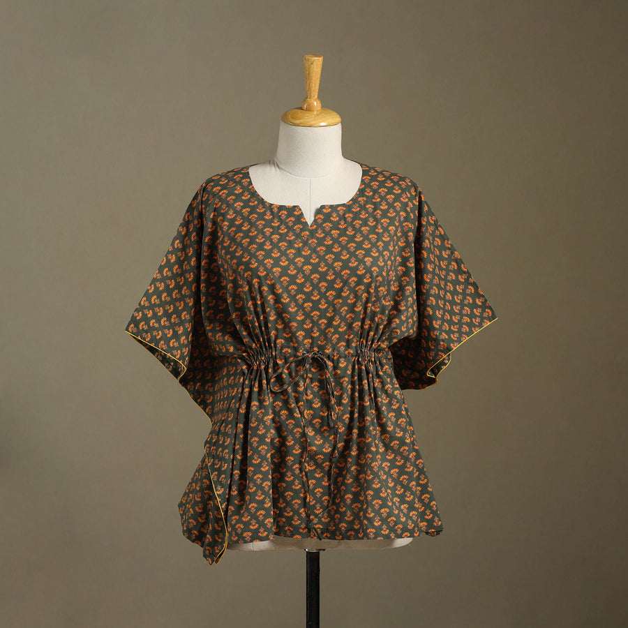Fine quality sanganeri block printed cotton kaftan with tie-up waist. A traditional kaftan or caftan is an short-length garment with long, flowing sleeves. It has an adjustable drawstring waist. These loose-fitting cotton kaftans are enhanced by a soft touch and beautiful hand prints. This dress will allow you to move with ease and comfort. The drawstring waist tie will give you the freedom to customize the fit to suit your unique shape.