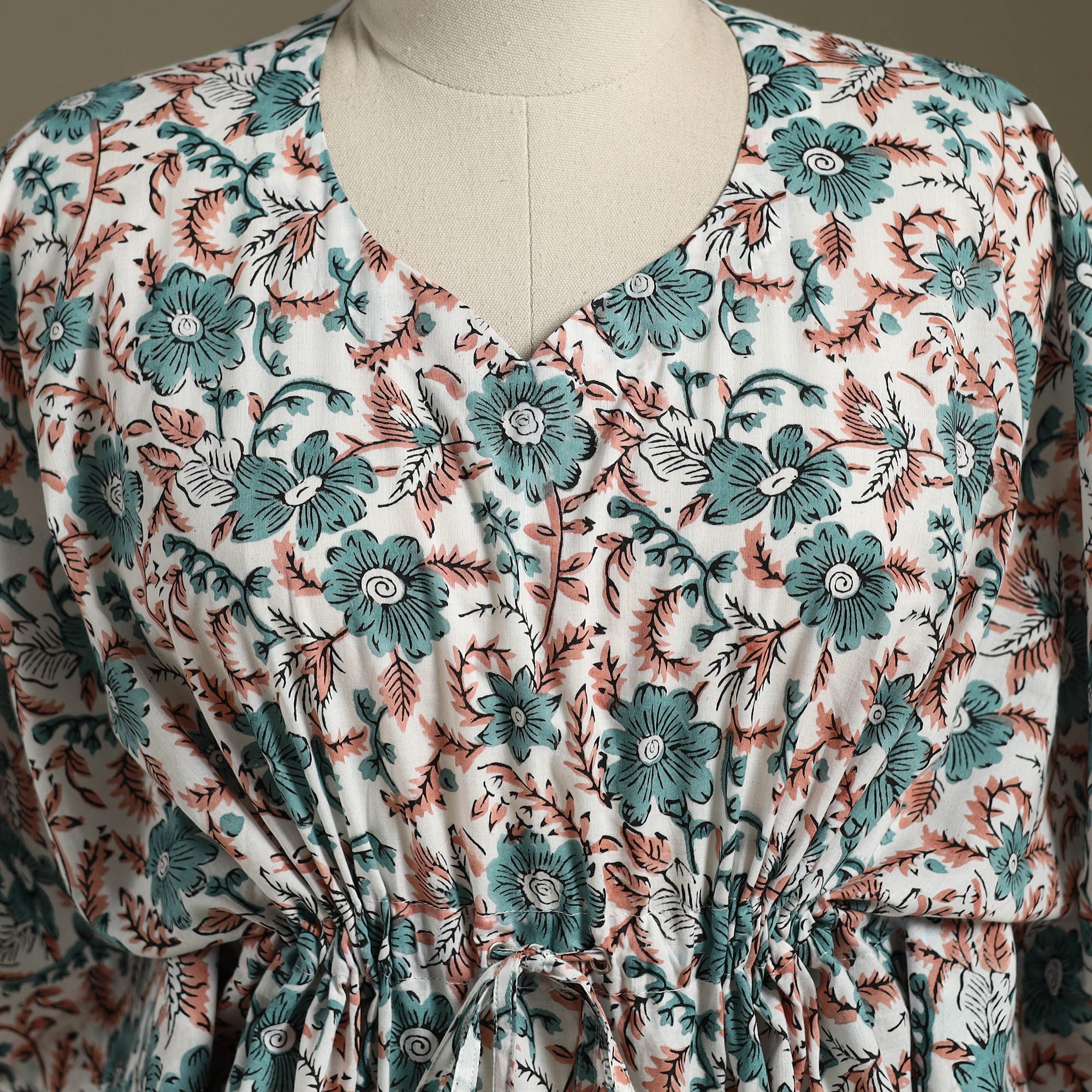 Fine quality sanganeri block printed cotton kaftan with tie-up waist. A traditional kaftan or caftan is an short-length garment with long, flowing sleeves. It has an adjustable drawstring waist. These loose-fitting cotton kaftans are enhanced by a soft touch and beautiful hand prints. This dress will allow you to move with ease and comfort. The drawstring waist tie will give you the freedom to customize the fit to suit your unique shape.